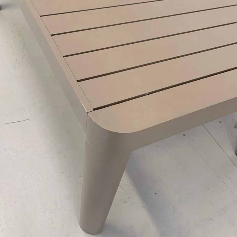 Kjo tavolinë e zgjatur prej alumini është një shembull i dizajnit elegant dhe funksional të përsosur për jashtë. Përfundimi dhe linjat e pastra të saj ngjallin një ndjenjë moderniteti dhe hapësire, duke ofruar një sipërfaqe tërheqëse për çdo rast, nga vaktet familjare deri te darkat me miqtë. Struktura e aluminit jo vetëm që garanton lehtësinë vizuale , por është gjithashtu sinonim i qëndrueshmërisë dhe rezistencës .