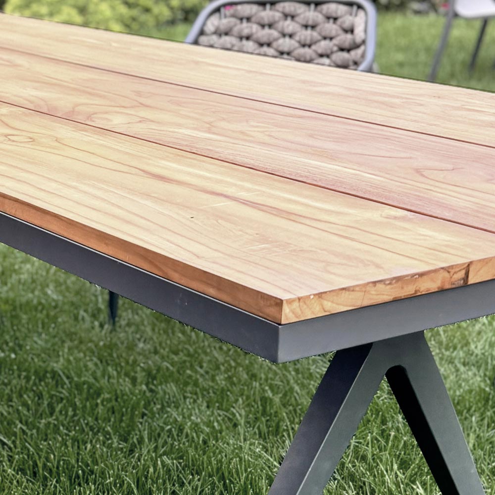 Protagonisti i vërtetë është pjesa e sipërme e rrasave të forta prej tik , një zgjedhje me vlerë artizanale që i jep tryezës një elegancë të përjetshme. Tiku, i njohur për vetitë e tij të jashtëzakonshme të rezistencës dhe qëndrueshmërisë , i jep tryezës një pamje të ngrohtë dhe mikpritëse, perfekte për ambiente të rafinuara të jashtme.