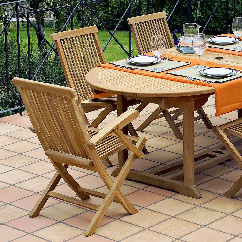Tavolinë kopshti prej druri tik e zgjerueshme me karrige dhe kolltuqe.