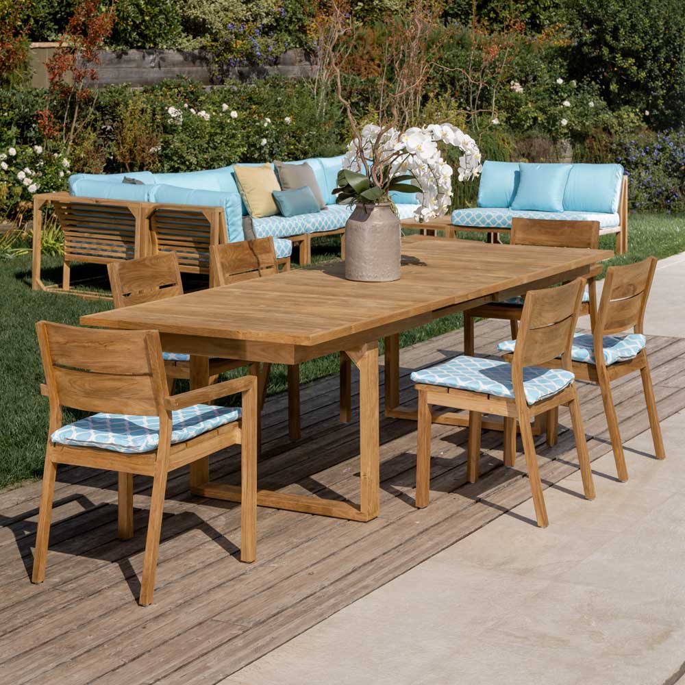 Tavolinë kopshti plotësisht e zgjerueshmeMe një kornizë druri tik me një sipërfaqe natyrale të lëmuar. Ky produkt, me linjat e tij të rafinuara dhe thelbësore , është perfekt për këdo që e do stilin modern dhe minimalist dhe për të organizuar praktikisht hapësirat e tyre të jashtme ose të mbrojtura.
