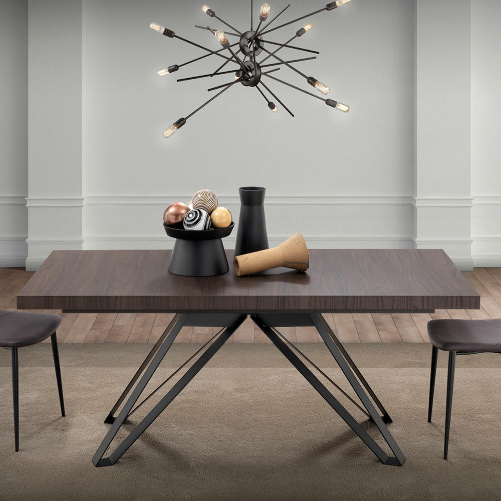 Kjo tryezë zgjatuese mishëron mjeshtërinë e mjeshtërisë moderne. Pjesa e sipërme e melaminës është e pasur dhe e ngrohtë, venat e saj natyrale formojnë një peizazh magjepsës nuancash dhe tekstesh që e bëjnë secilën pjesë unike. Pamja e fortë e drurit është në kontrast me siluetën e hollë dhe të përcaktuar të bazës, duke ofruar një pikë takimi midis natyralitetit dhe dizajnit industrial.