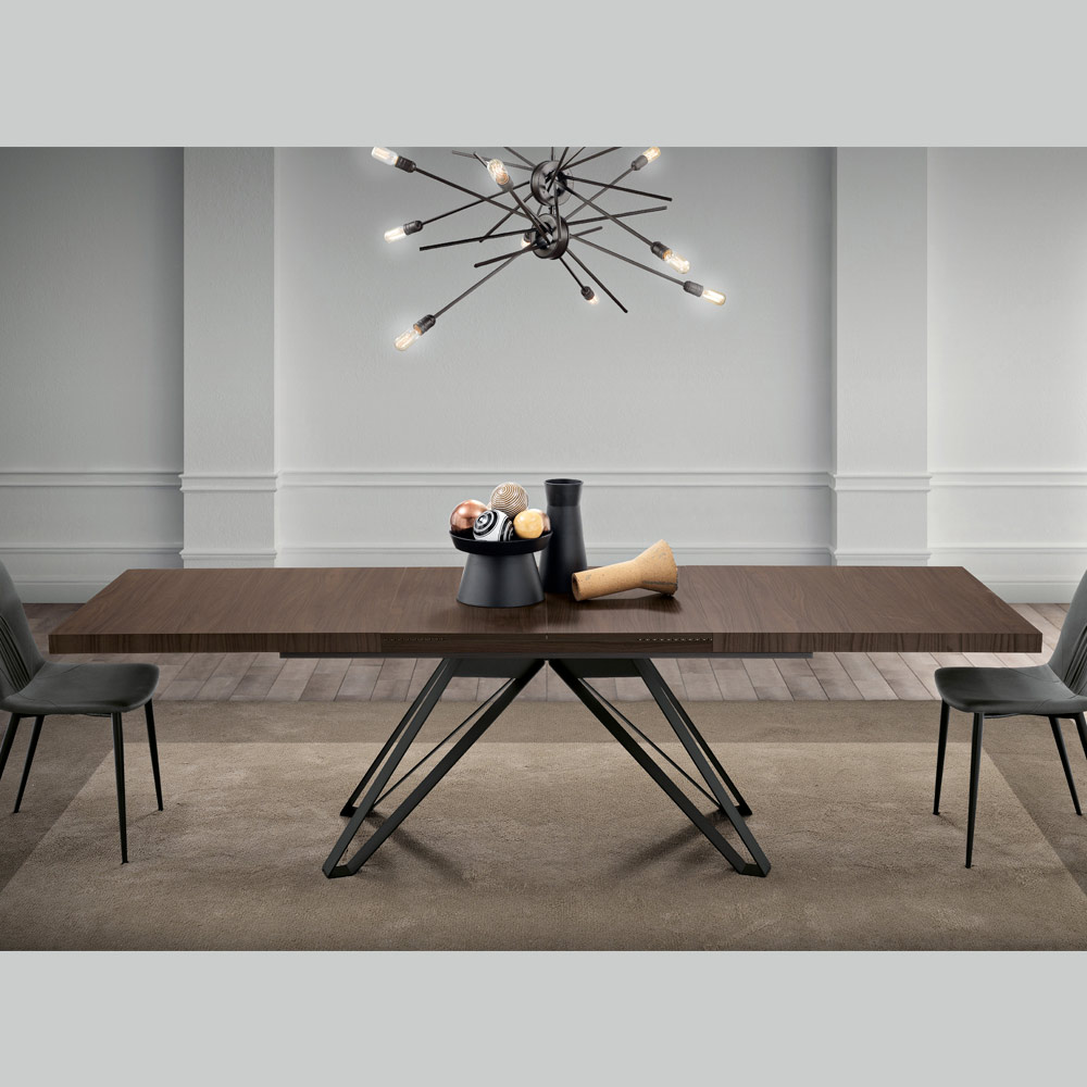 Këmbët, në metal të zi në formën e një A-je të përmbysur, dallohen për strukturën e tyre gjeometrike dhe përfundimin mat, një shembull se si funksionaliteti dhe stili mund të bashkohen në mënyrë harmonike. Dizajni lejon që tavolina të zgjerohet lehtësisht, duke siguruar që ajo të jetë po aq e përshtatshme për përdorim të përditshëm sa edhe për organizimin e rasteve të veçanta.