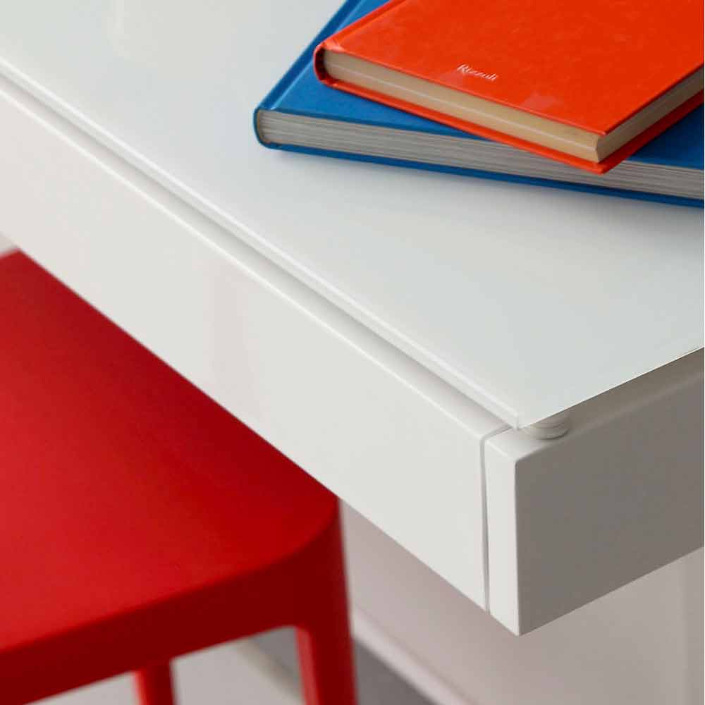 Tavolinë e varur me montim në mur e prodhuar në Itali me majë xhami në fund të bardhë me shkëlqim me vrima kablloje, strukturë në metal të bardhë mat dhe panel vertikal të lëvizshëm në pleksiglas të bardhë . Është gjithashtu i kompletuar me ndriçim LED të vendosur në krye dhe një sirtar praktik që tërhiqet.