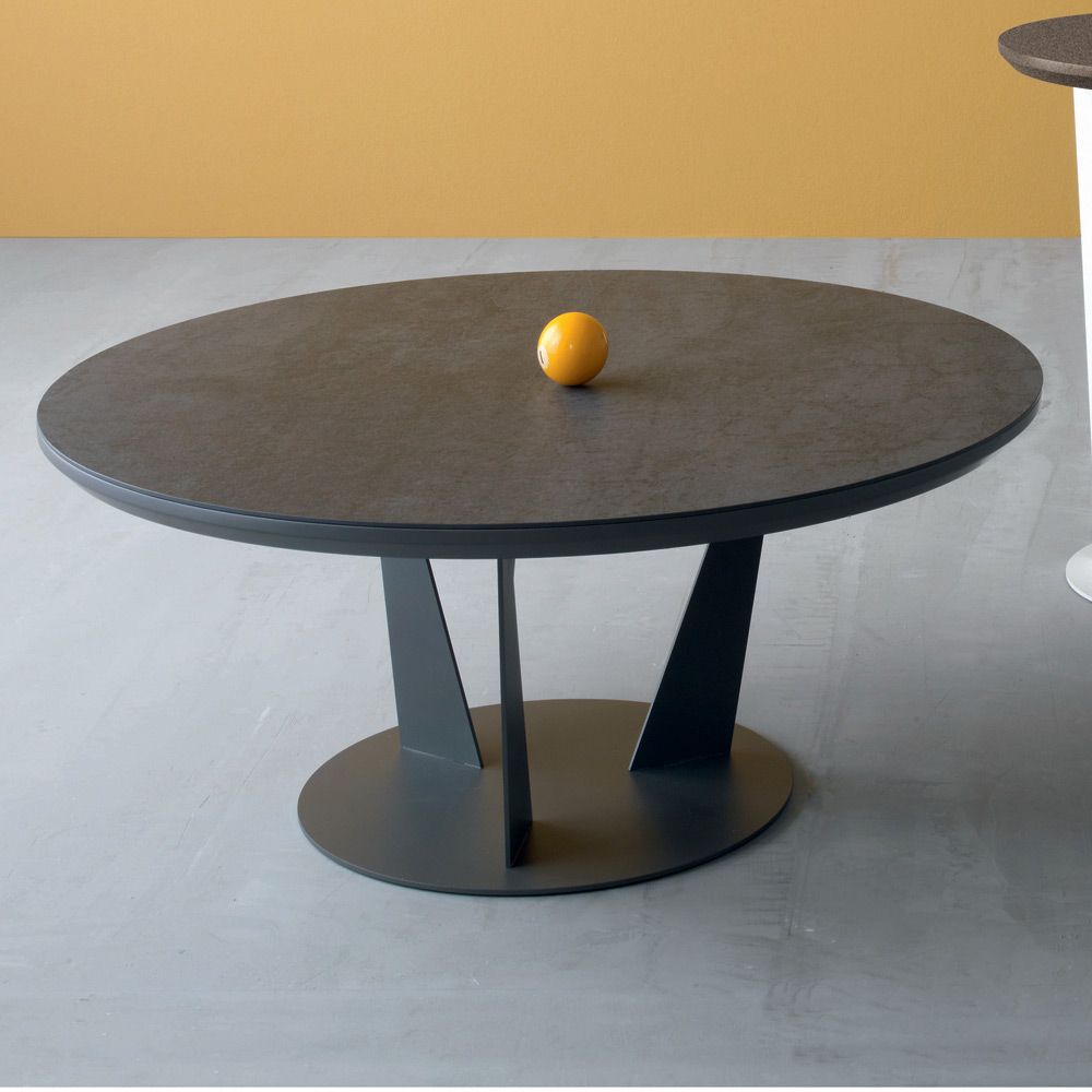 Tavolinë kafeje e rrumbullakët në pjesën e sipërme të pjerrët metalike dhe qeramike, 3 përmasash prodhim Italie.