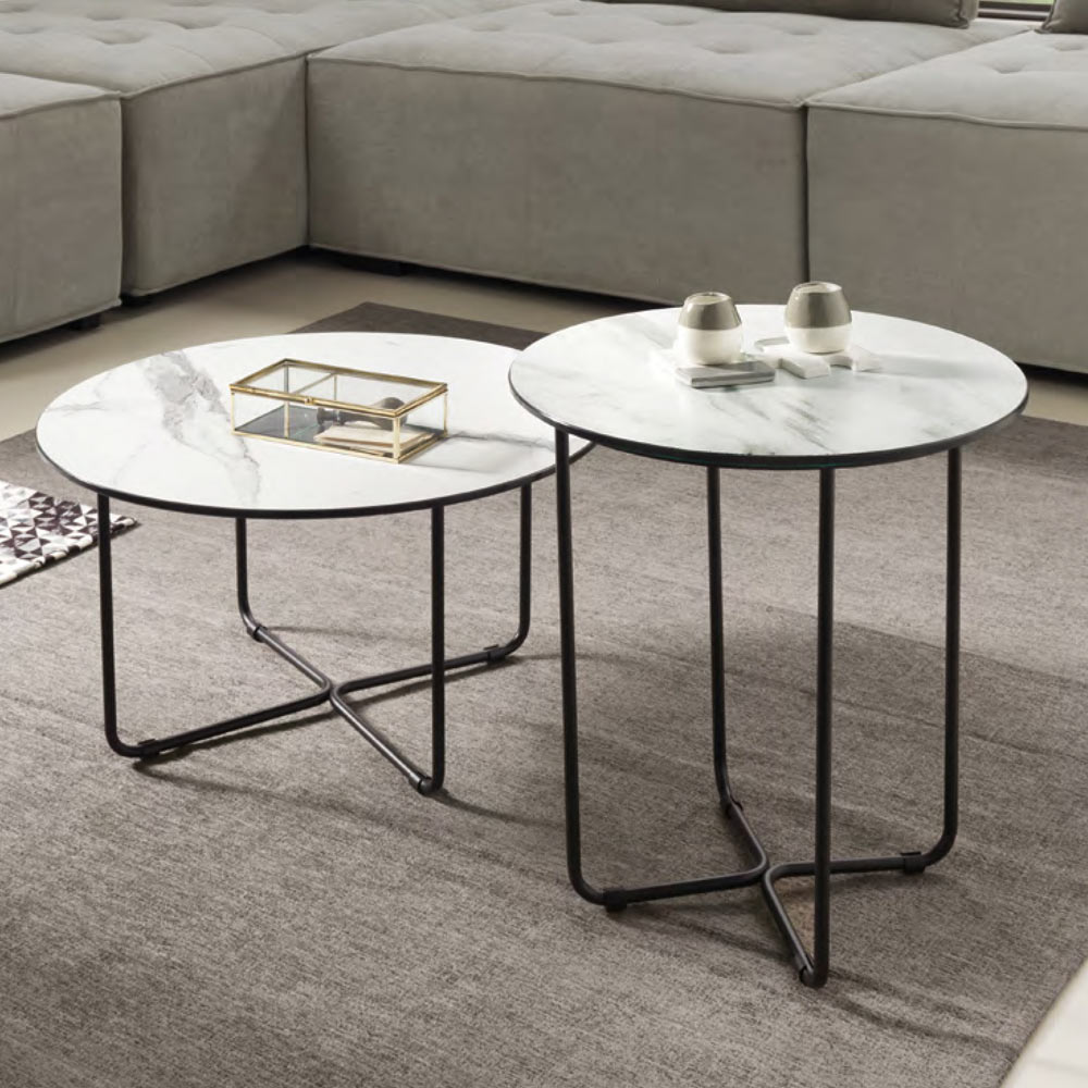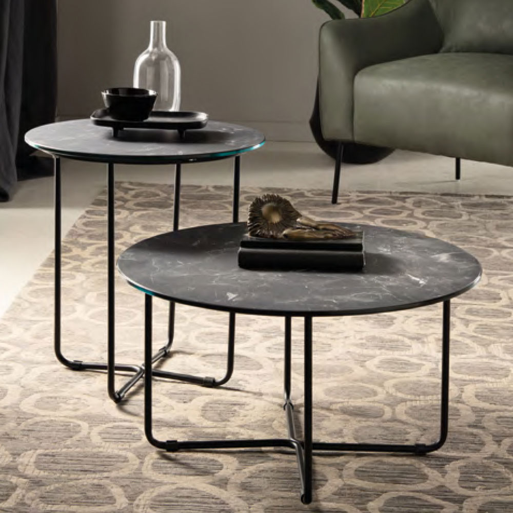 Tavolinë kafeje me majë prej xhami të laminuar me efekt mermeri dhe strukturë në metal të lyer me ngjyrë të zezë . Një pjesë e mobiljeve që vjen nga një prodhim Made in Italy nëpërmjet përdorimit të lëndëve të para cilësore të cilat ndihmojnë për të siguruar një rezultat përfundimtar me cilësi të lartë dhe vëmendje ndaj detajeve. Dizajni i tij karakterizohet nga forma të rrumbullakosura dhe linja të përkulura që krijojnë harmoni dhe i japin një ndjesi dinamizmi produktit. Estetika e saj bëhet unike nga sipërfaqja e mrekullueshme me efekt mermeri që i jep tryezës një prekje të rafinuar dhe avangarde .
