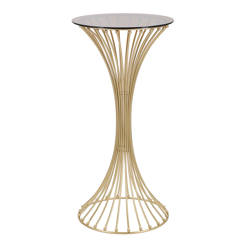 Kjo tavolinë e lartë kafeje është një shembull i dallueshëm i elegancës dhe dizajnit bashkëkohor . Baza e artë ngrihet në një lëmsh elegante vijash që kujtojnë degët e holla të një bime, duke mbështetur një majë xhami rrethore. Kombinimi i xhamit dhe hekurit të artë jo vetëm që rrit bukurinë vizuale , por flet edhe për cilësinë e materialeve, duke siguruar qëndrueshmëri dhe qëndrueshmëri .
