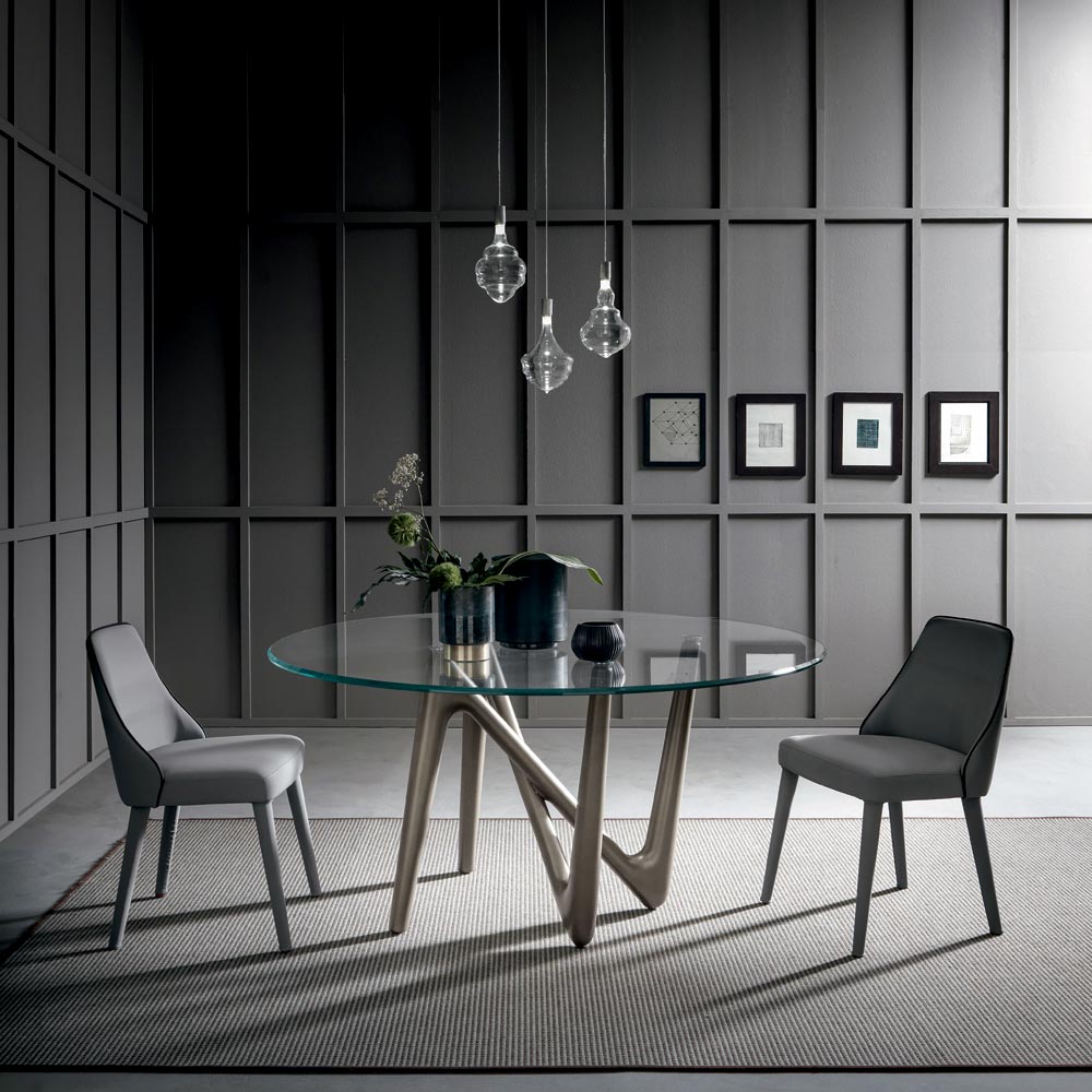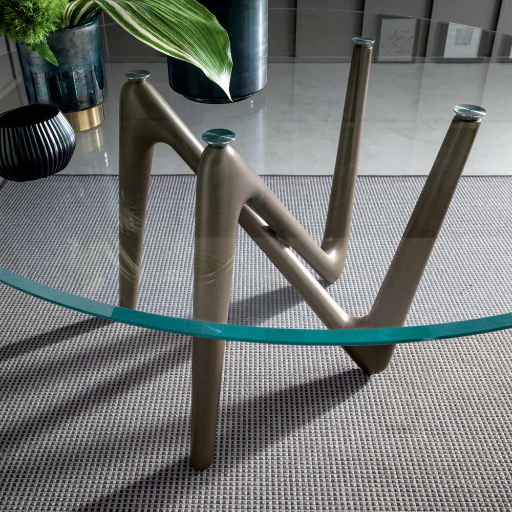 Kjo tavolinë e rrumbullakët e ngrënies ka një strukturë me këmbë në poliuretani të ngurtë të lyer me bronz metalik dhe një majë në formë fuçie në xhami të kalitur transparent tepër të pastër me buzë të pjerrëta.