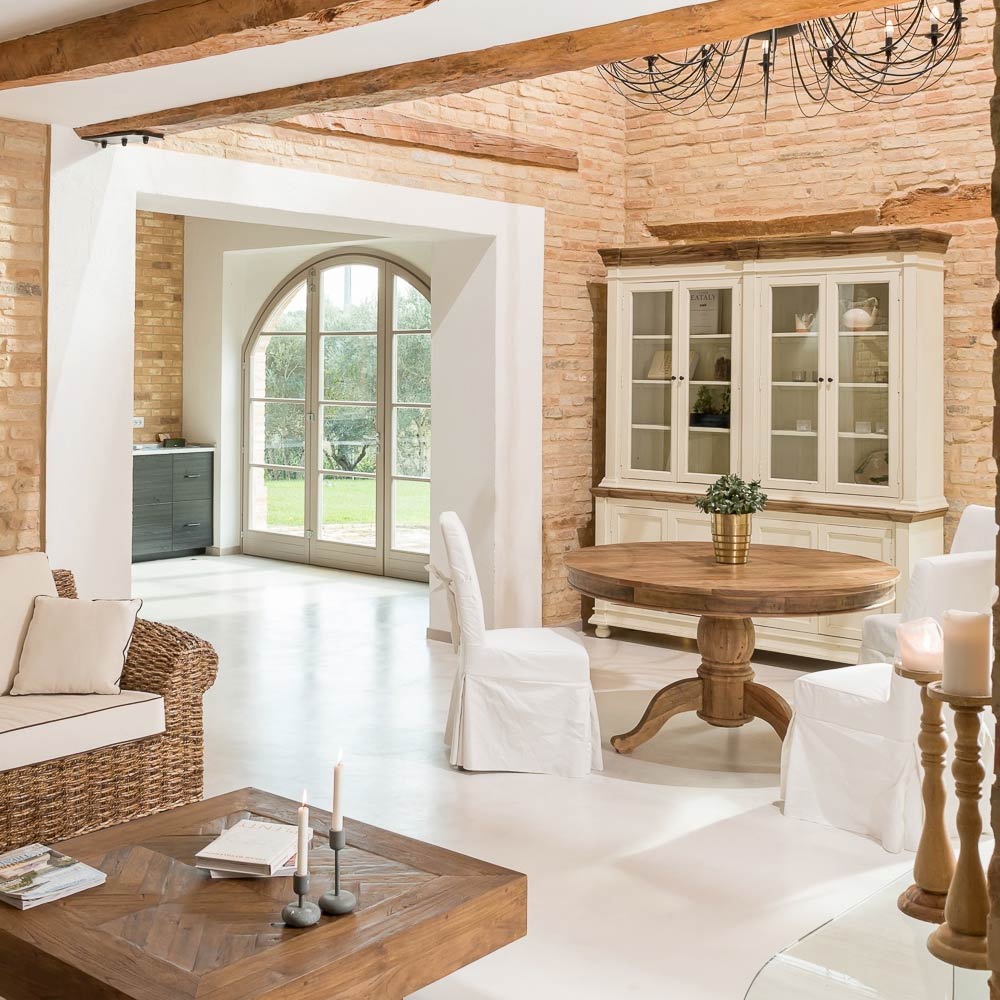 Tavolina e rrumbullakët e ngrënies e bërëne ngjyre druri te ricikluar kafe natyrale . Ky grup mobilimi është fjalë për fjalë unik pikërisht sepse mishëron historinë e veçantë të materies së jetuar. Përpunimi bëhet në pjesën më të madhe sipas procedurave artizanale . Çdo gërvishtje dhe papërsosmëri, çdo mbresë në dru, dëshmon origjinalitetin e një të shkuare që merr jetë të re. Druri tropikal i ricikluar ligjërisht nga objektet e vjetra, varkat dhe ndërtesat e braktisura trajtohet dhe pastrohet me mjeshtëri për të rifituar dinjitetin dhe shkëlqimin. Ky produkt kombinon thelbin e shijes rustike me format e dizajnit bashkëkohor dhe me disa detaje të stilit industrial .