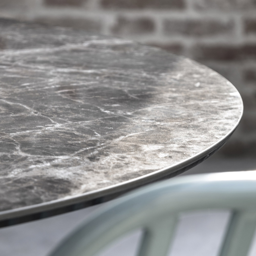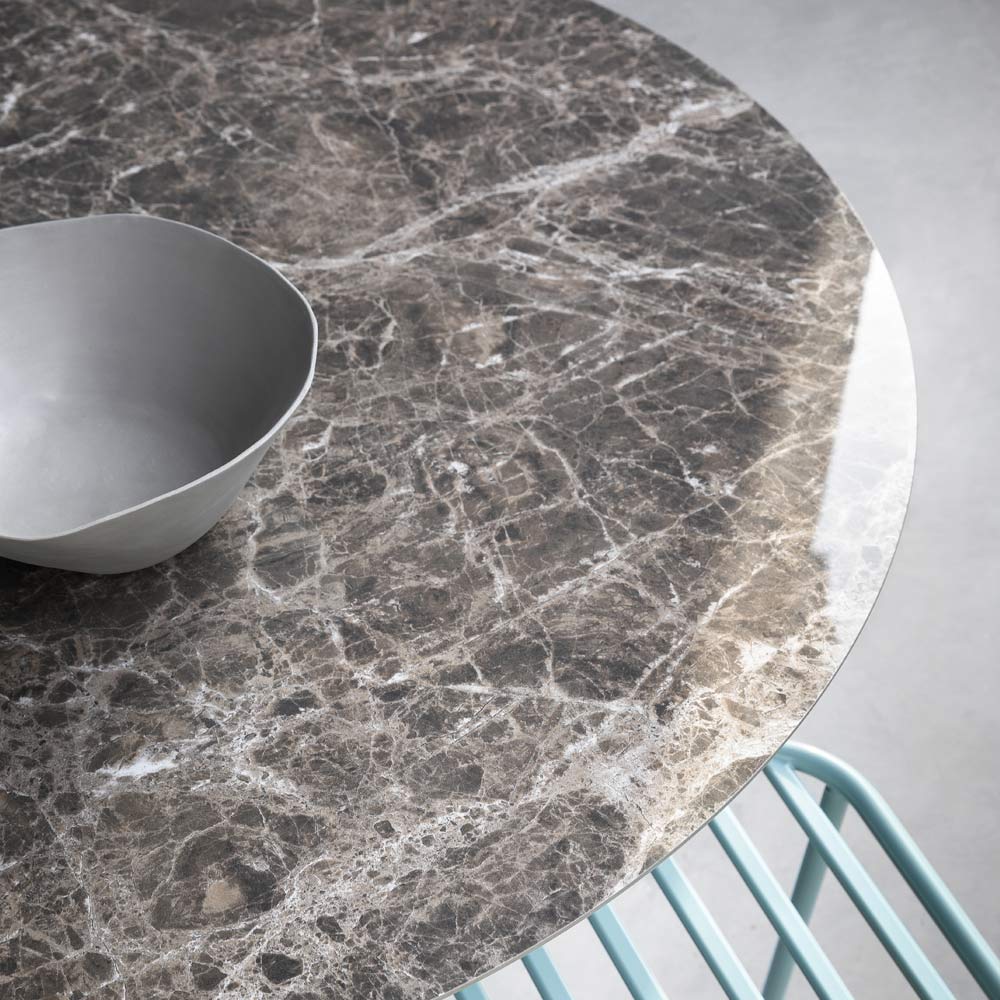 Tavolinë e rrumbullakët e ngrënies prej qelqi qeramike dhe metalike Prodhuar në Itali.