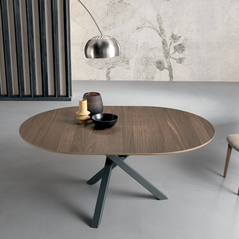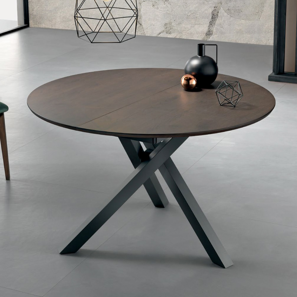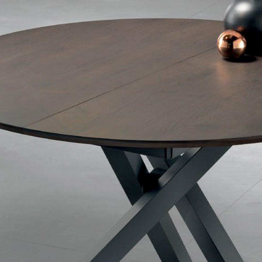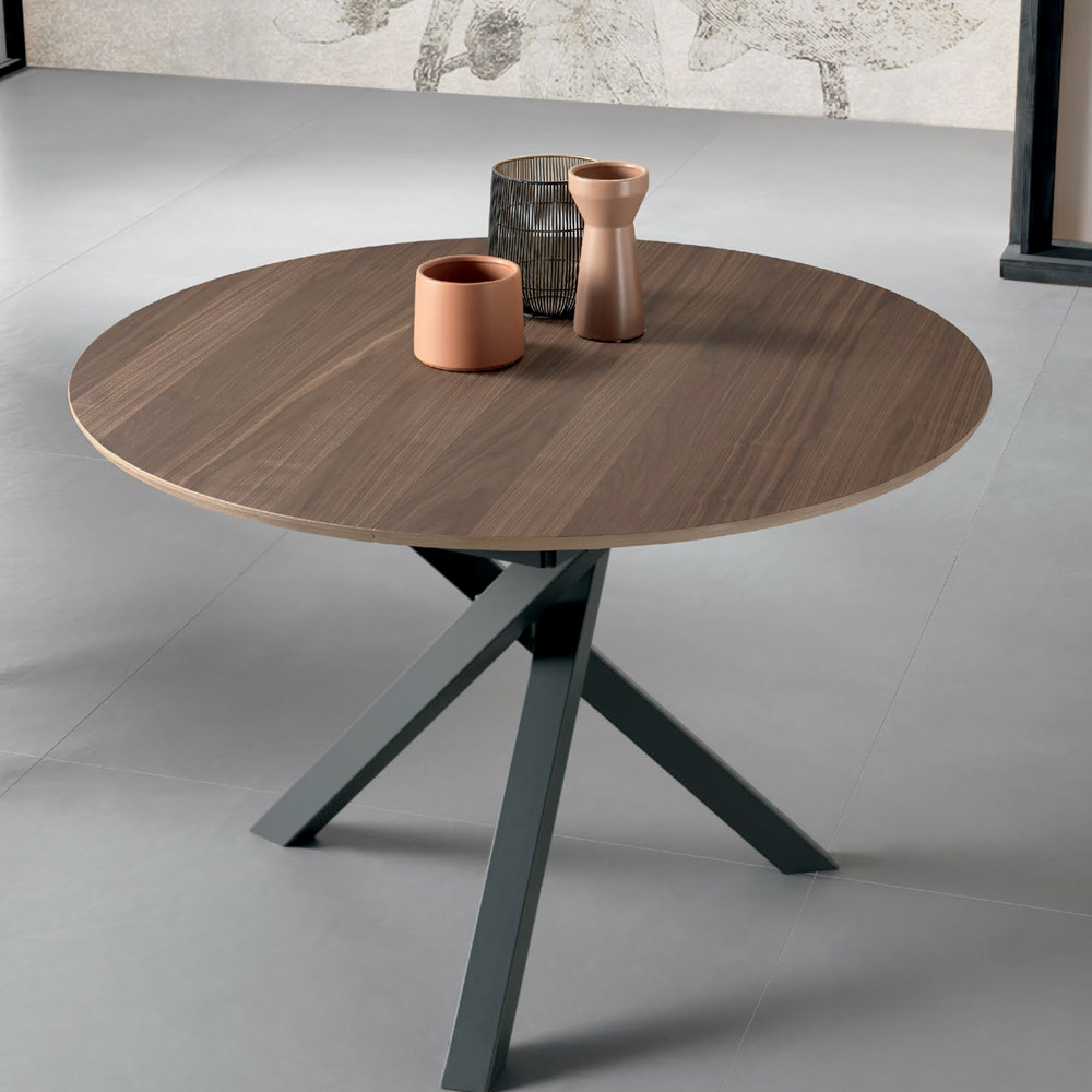 Tavolinë e rrumbullakët, me diametër 120 cm, e zgjerueshme deri në 170 cm, me sipërfaqe të veshur me rimeso arre Canaletto me trashësi 20 mm dhe profil të pjerrët.