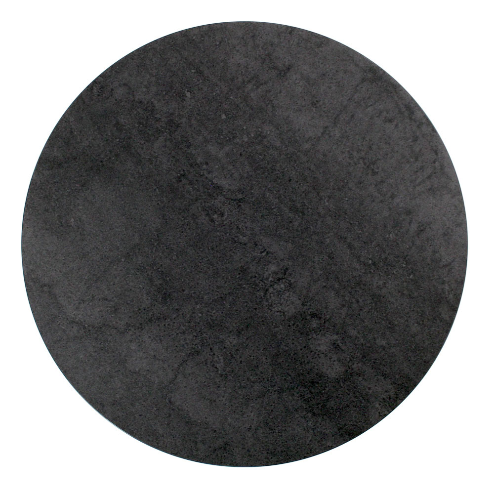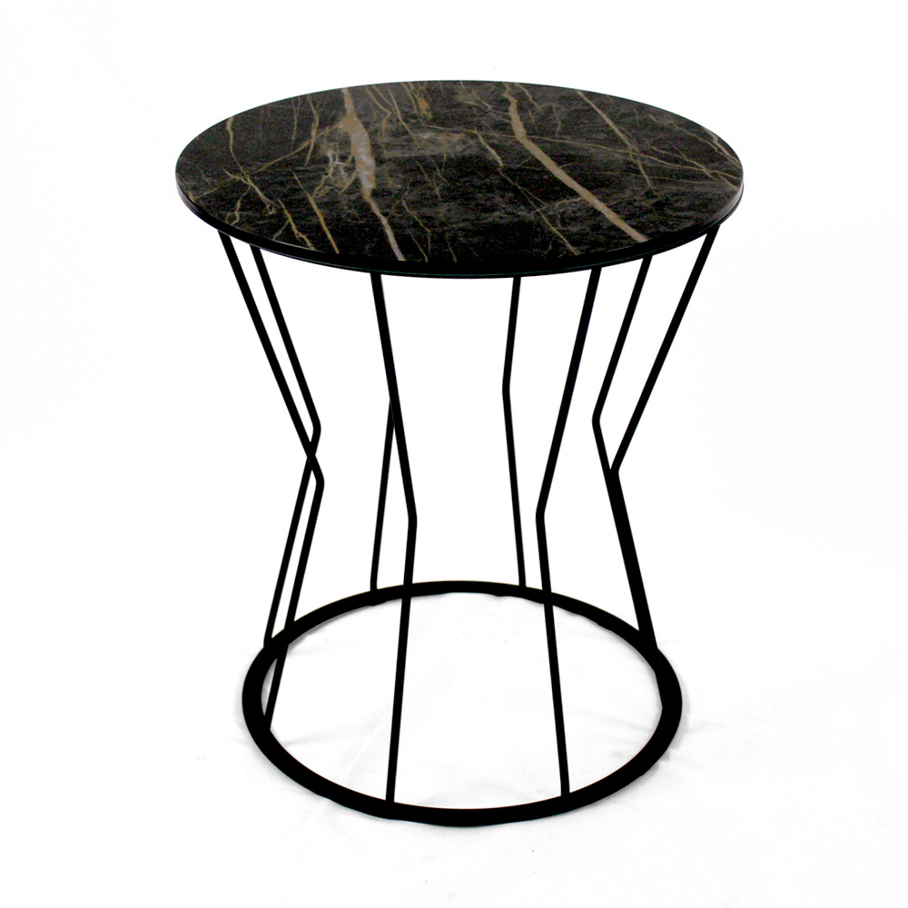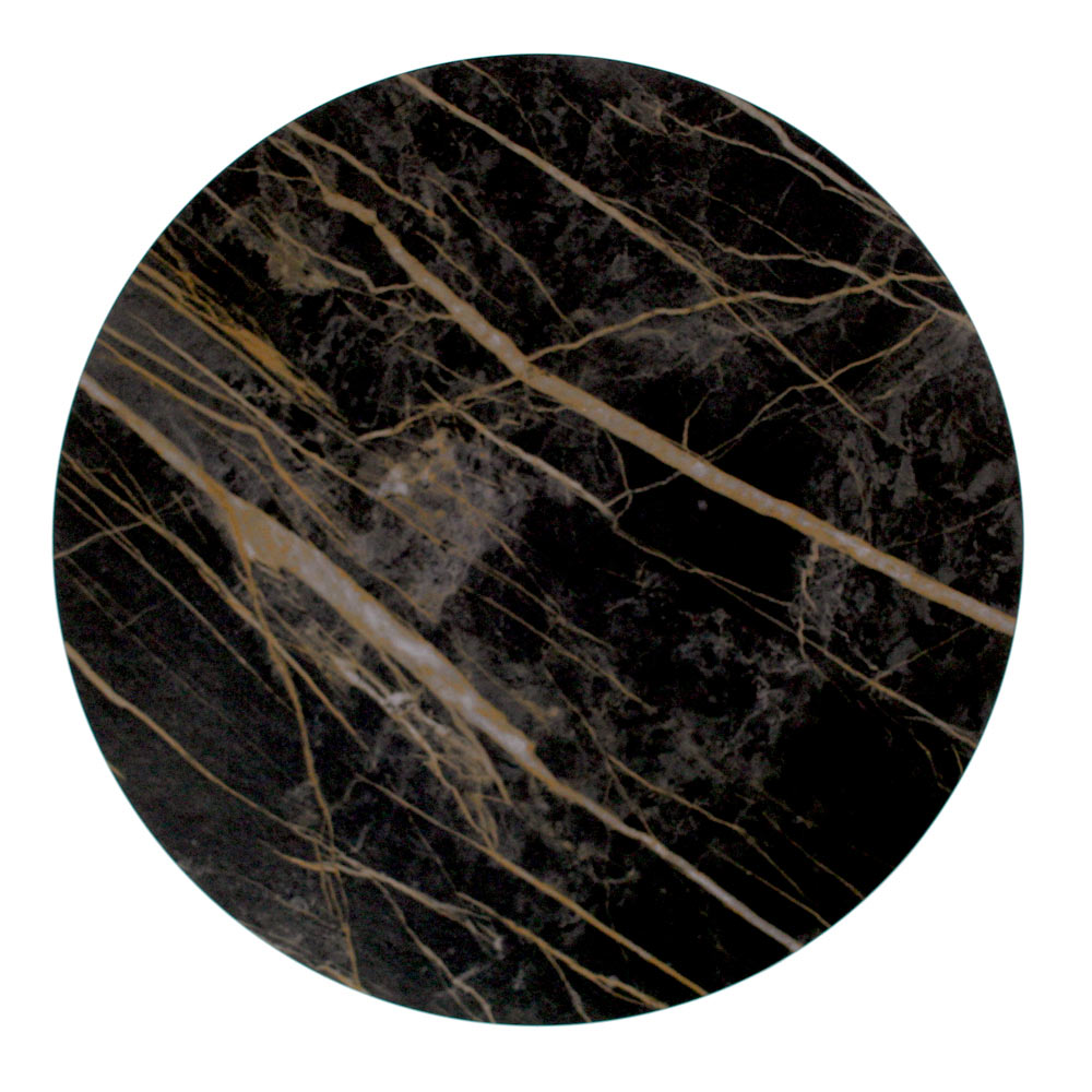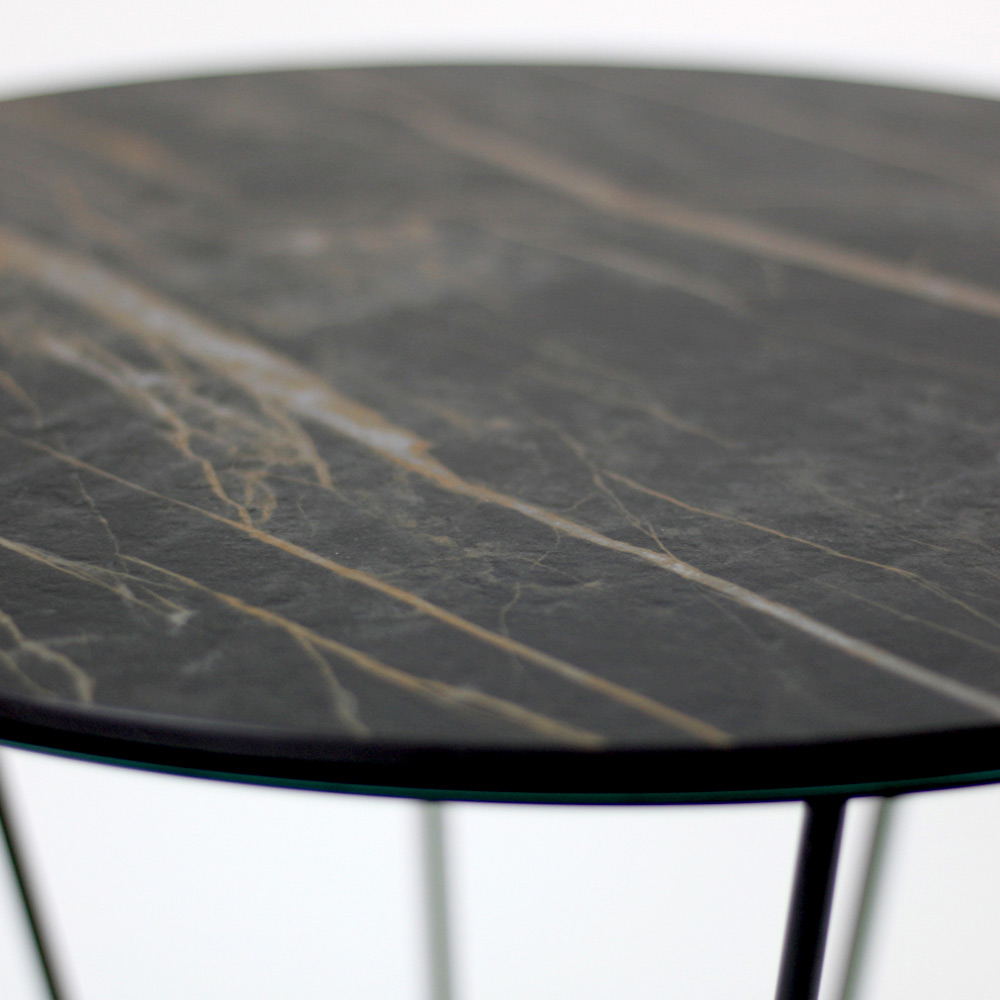 Tavolinë e rrumbullakët me bazë çeliku të lyer dhe maja e gurit prej porcelani.