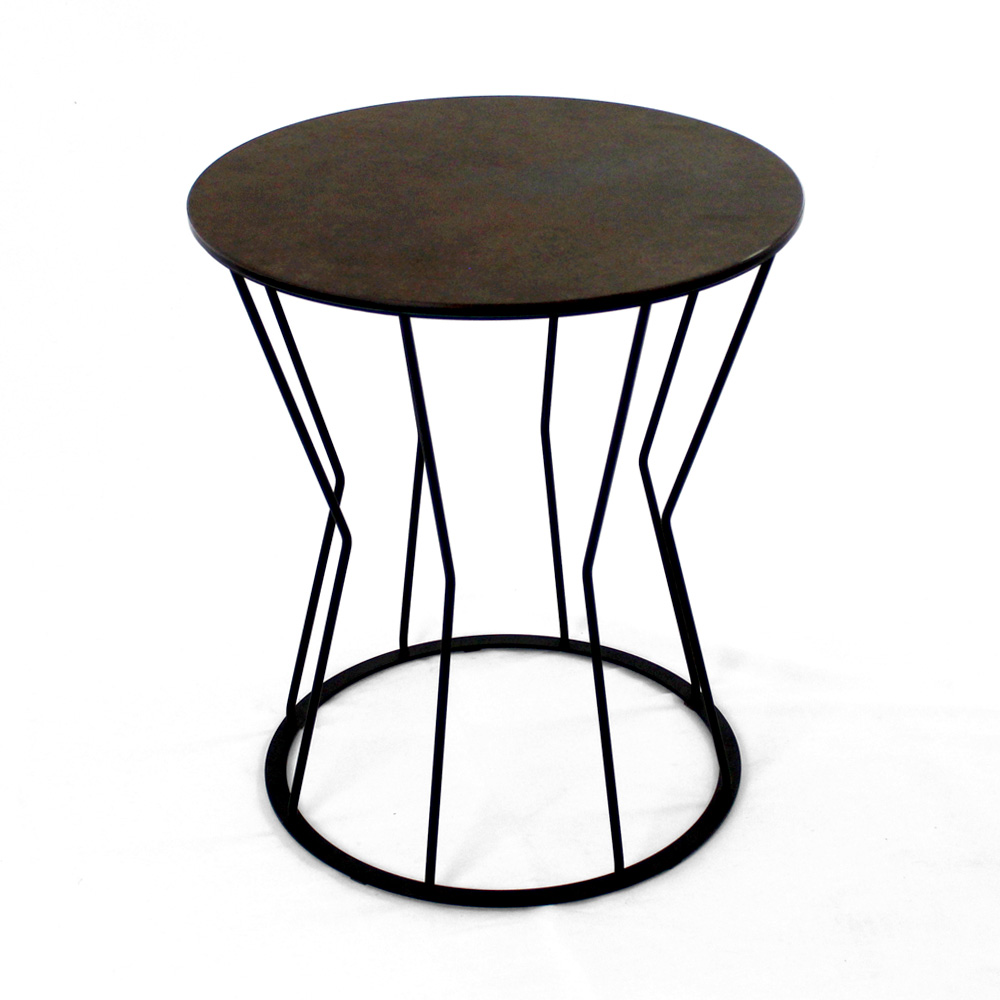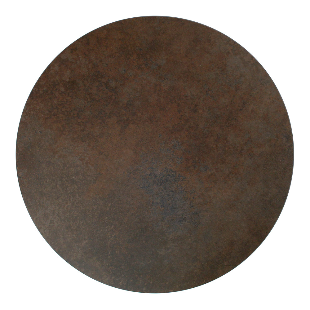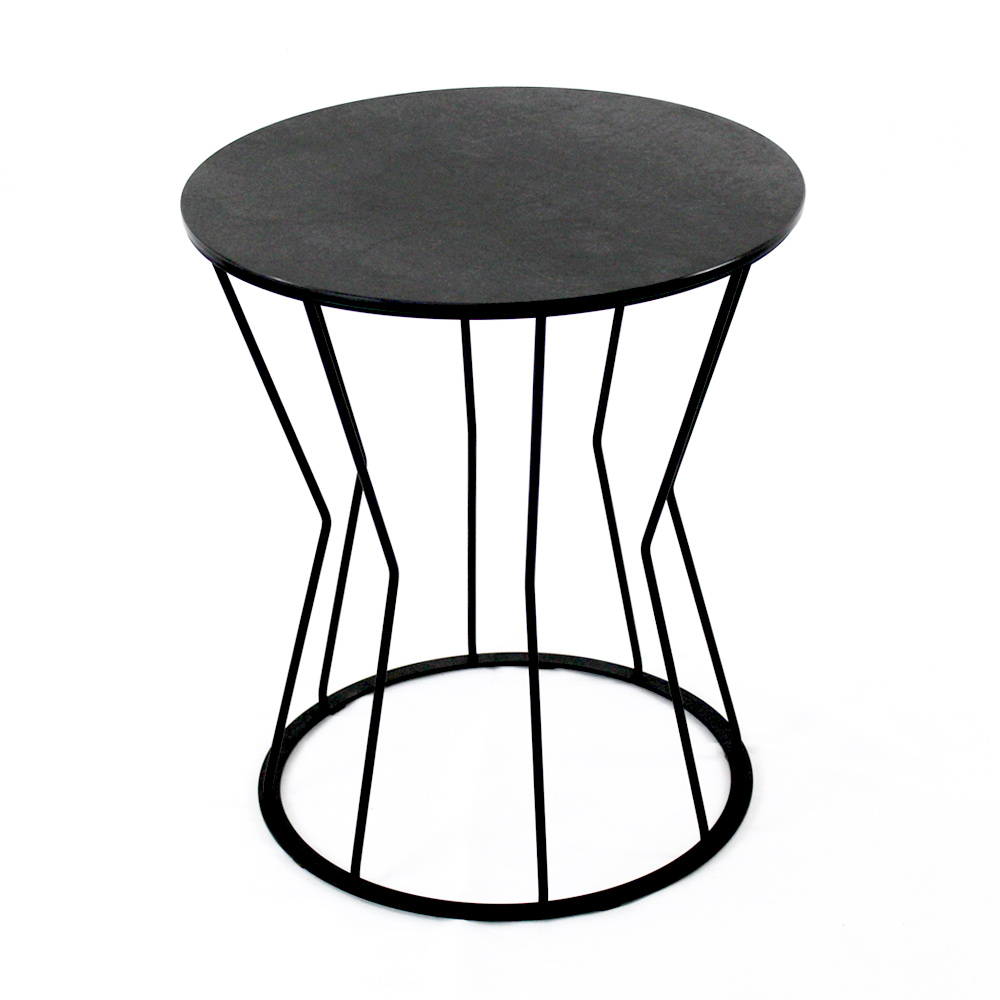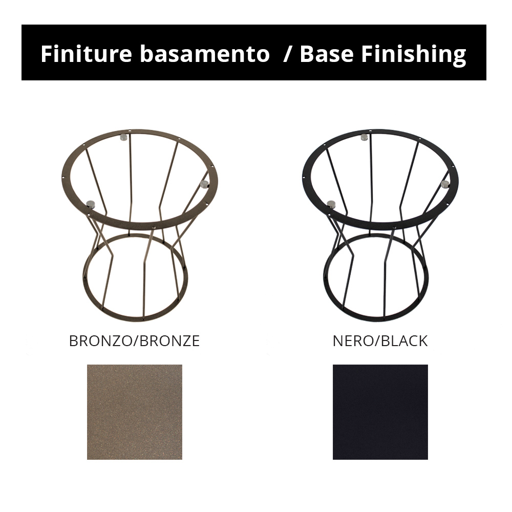 Tavolinë e rrumbullakët me bazë çeliku të lyer dhe maja e gurit prej porcelani.