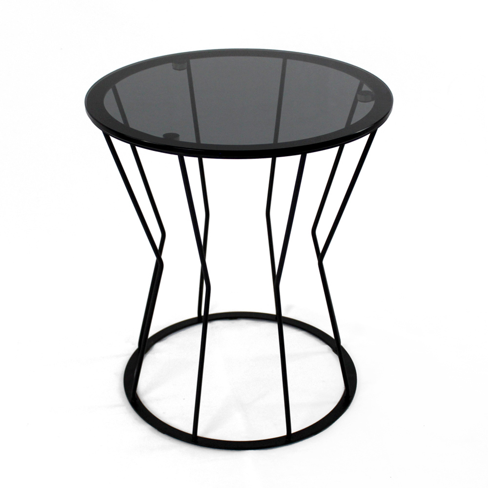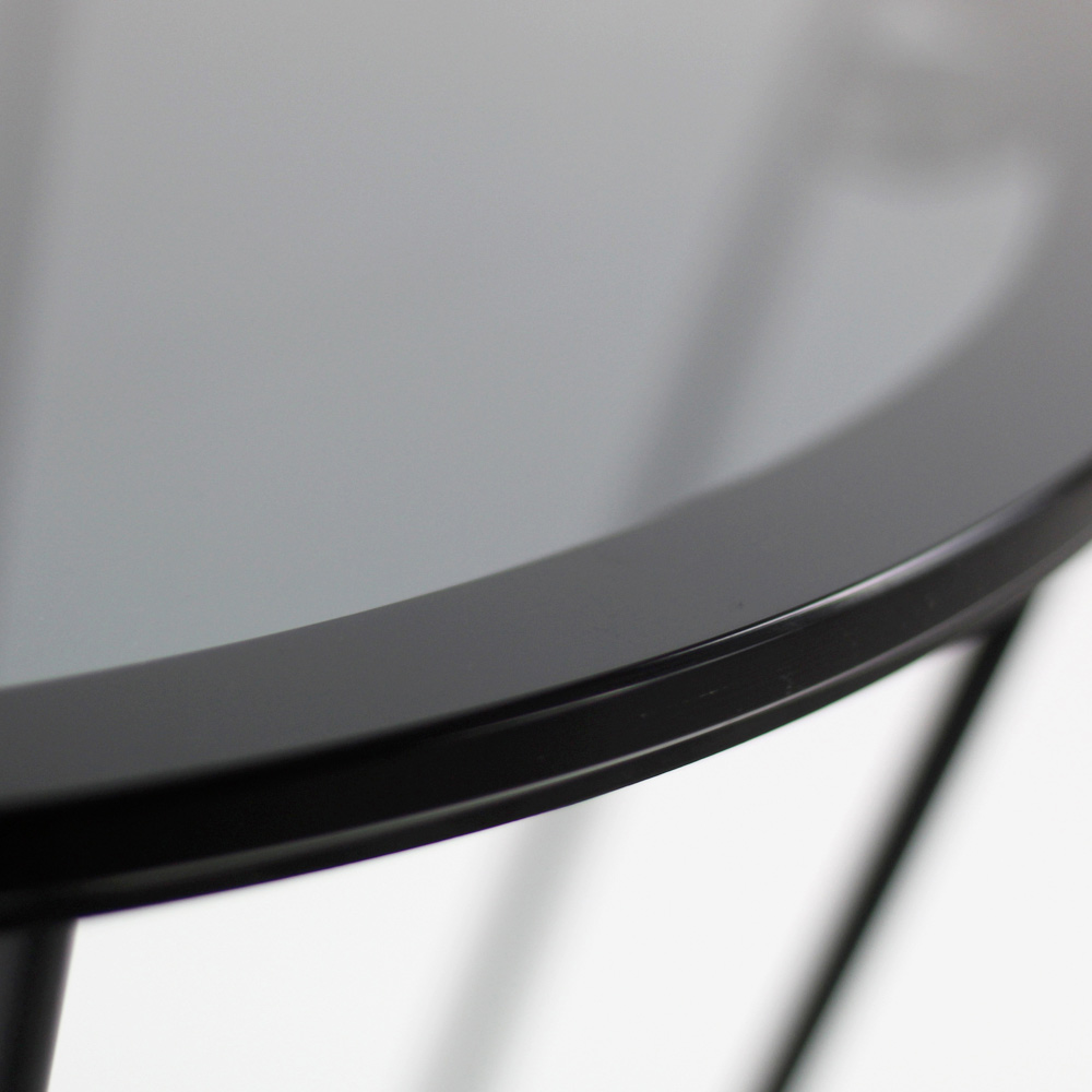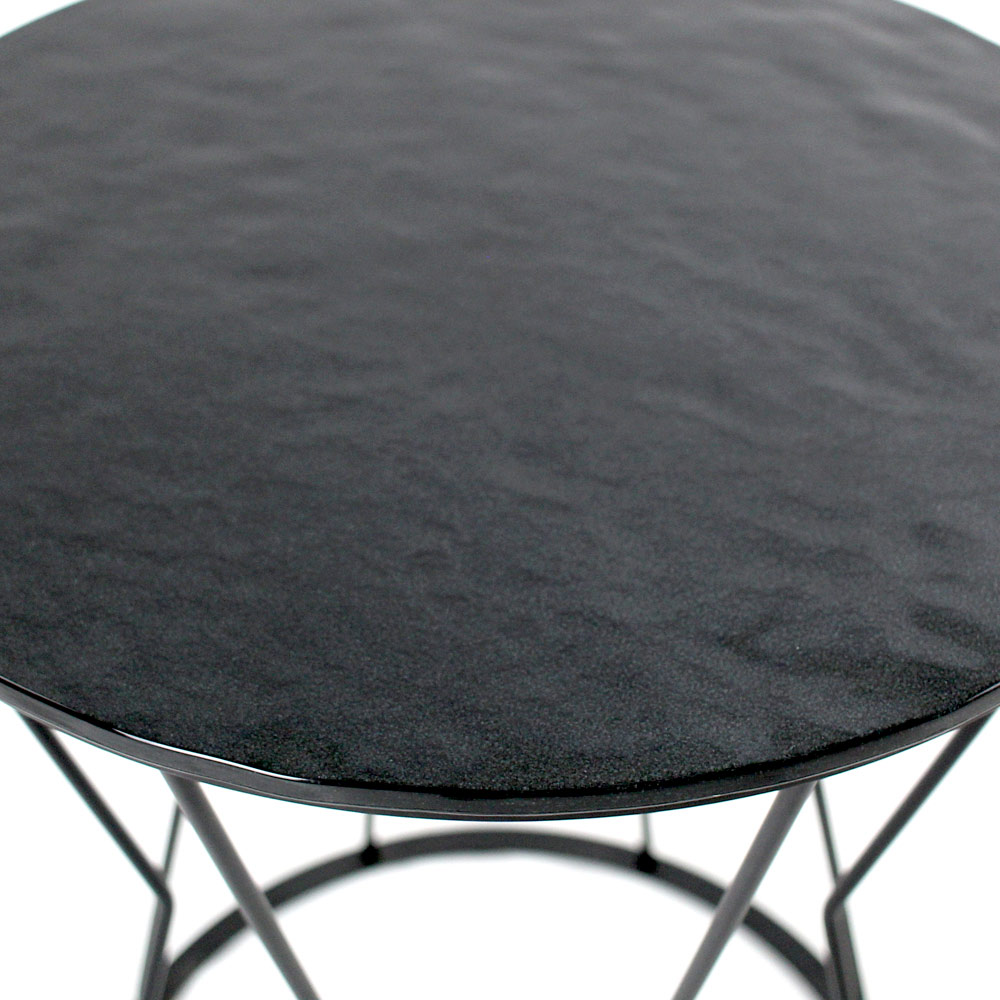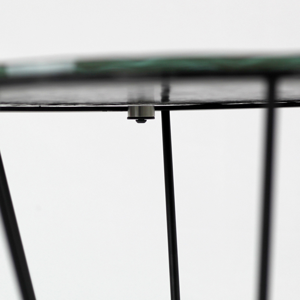 Tavolinë e rrumbullakët me bazë çeliku të lyer dhe majë xhami.