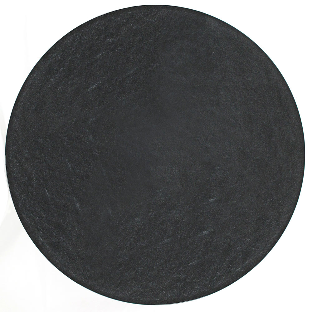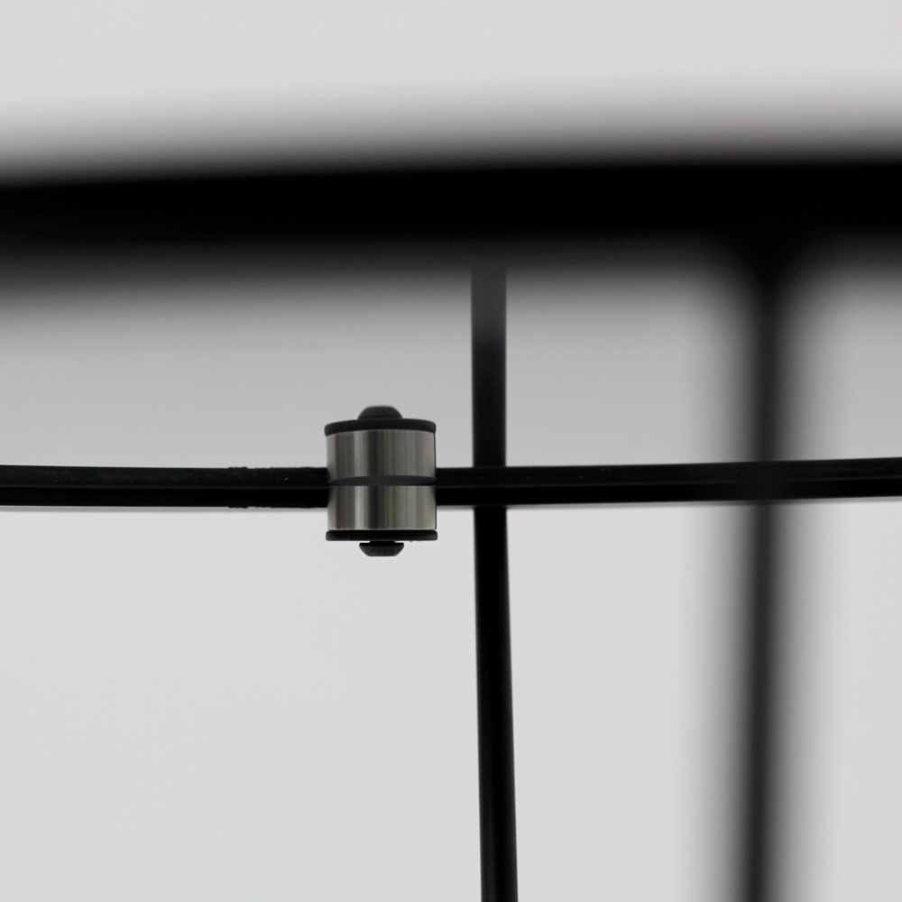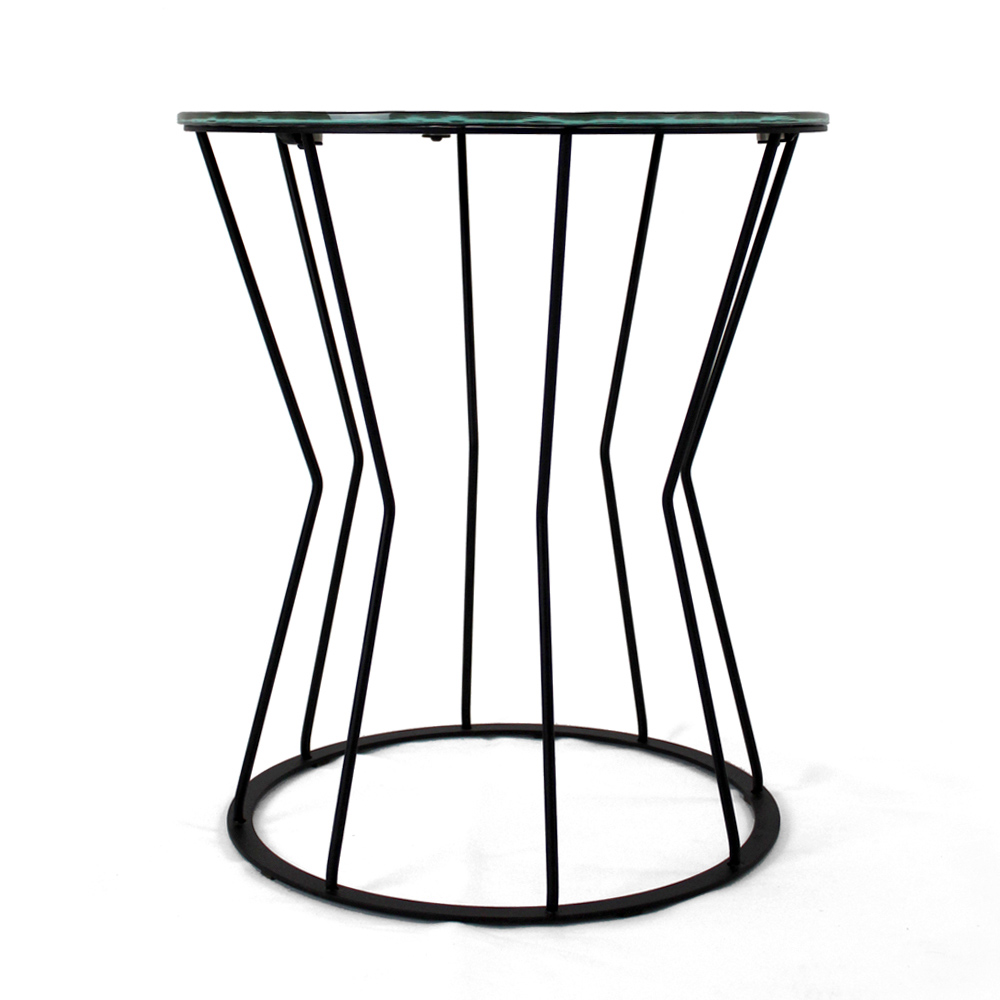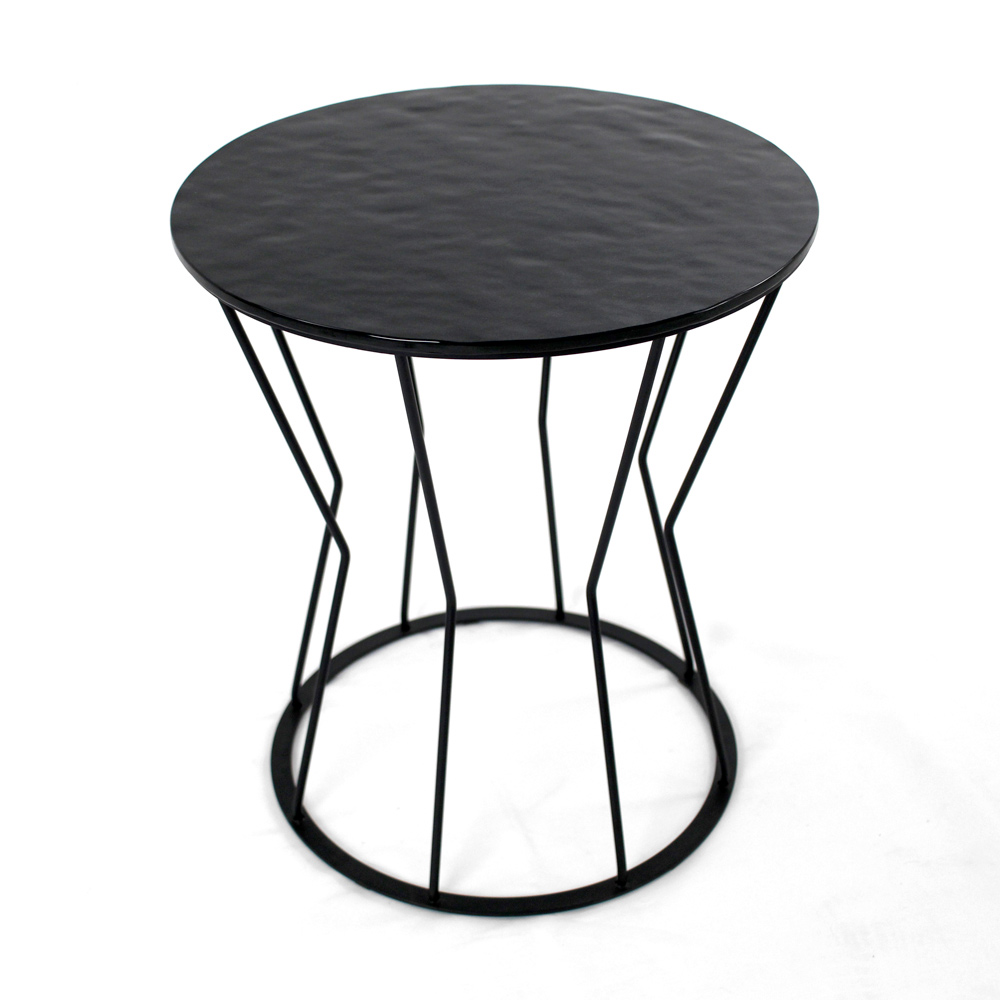 Tavolinë e rrumbullakët me bazë çeliku të lyer dhe majë xhami.