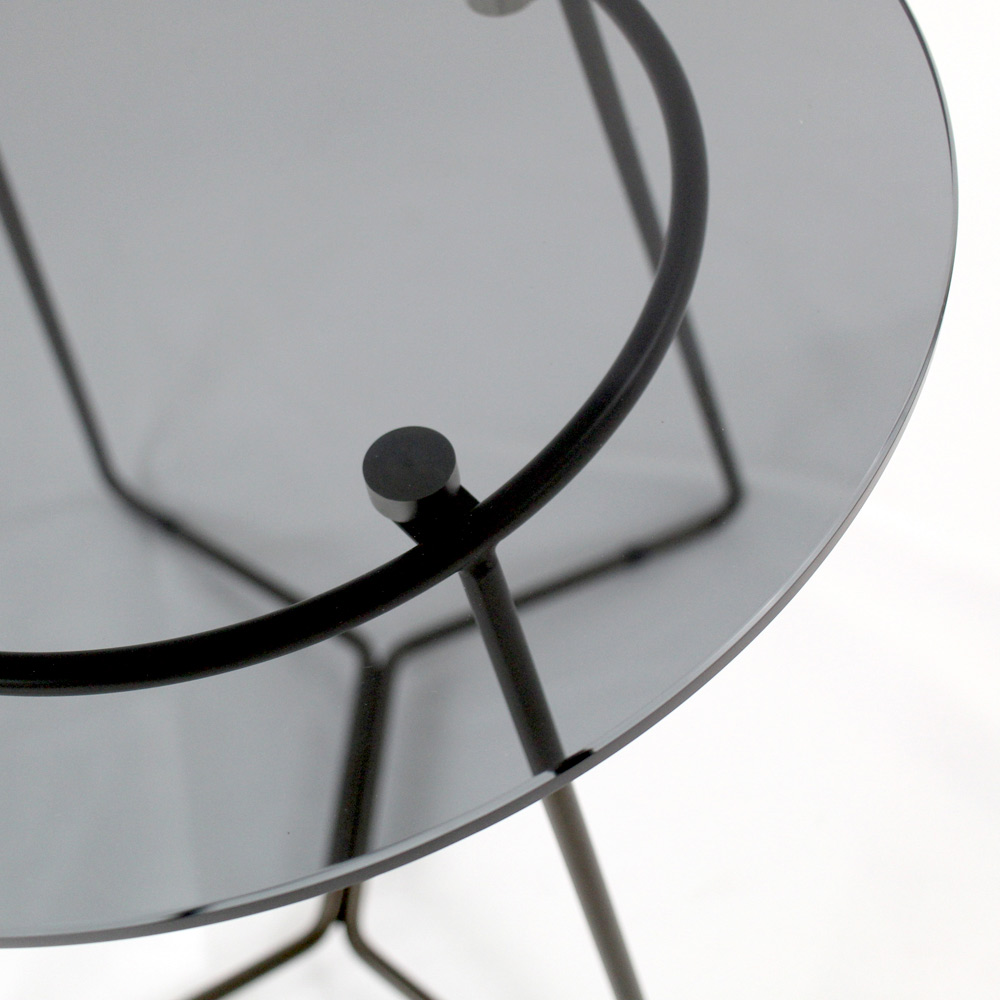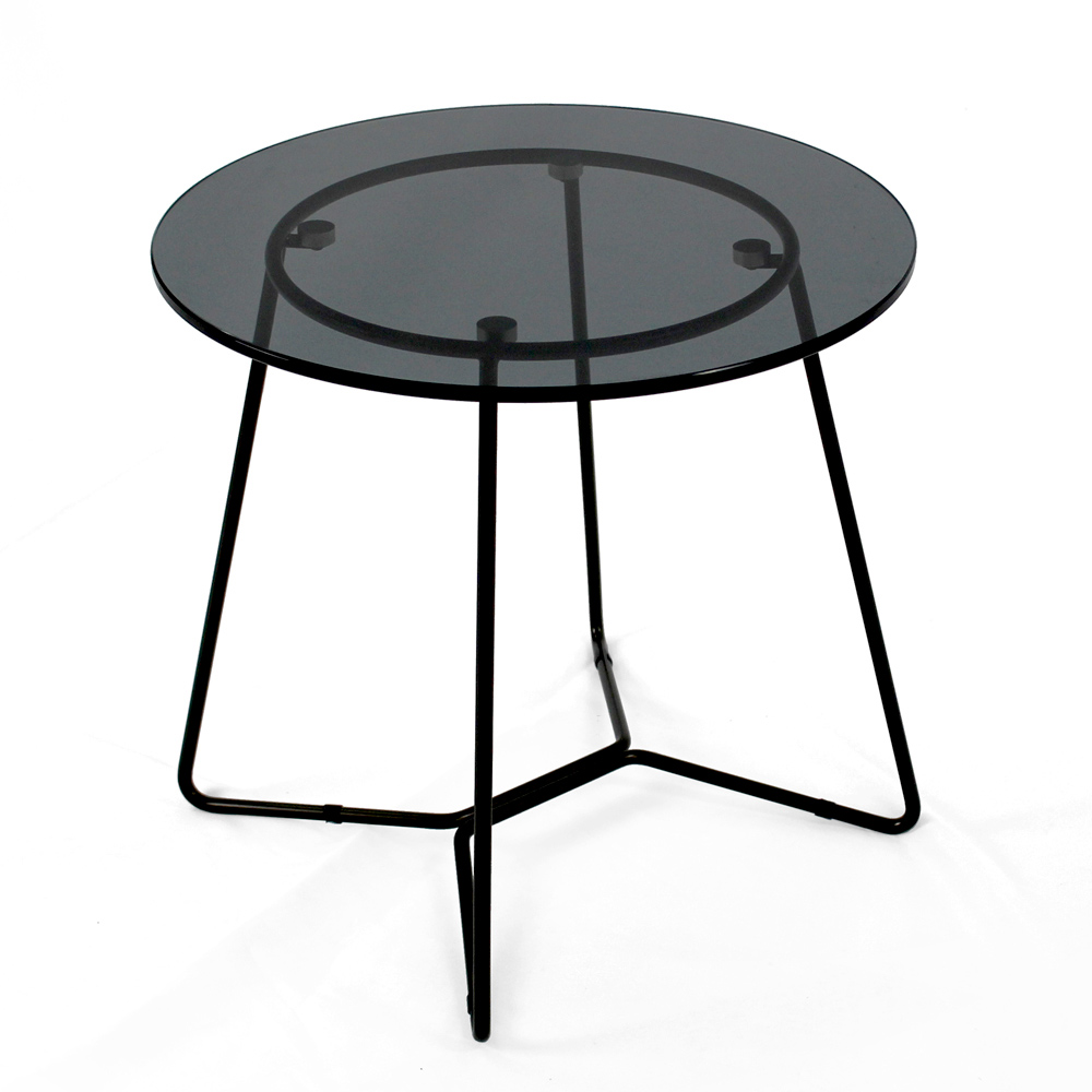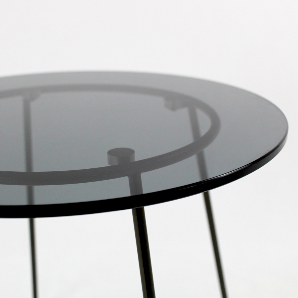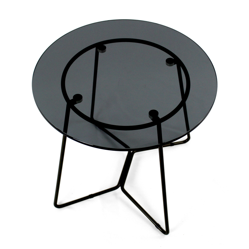 Tavolinë e rrumbullakët me bazë çeliku të lyer dhe majë xhami.