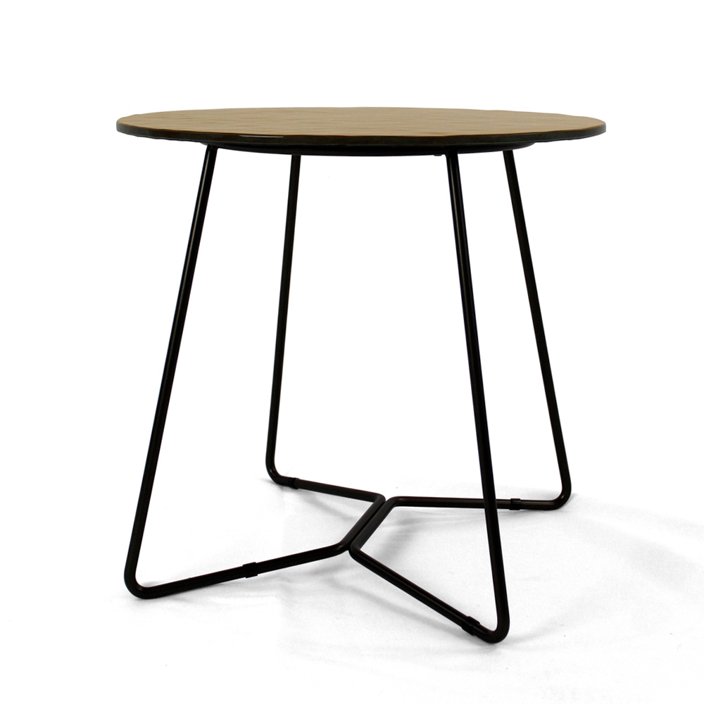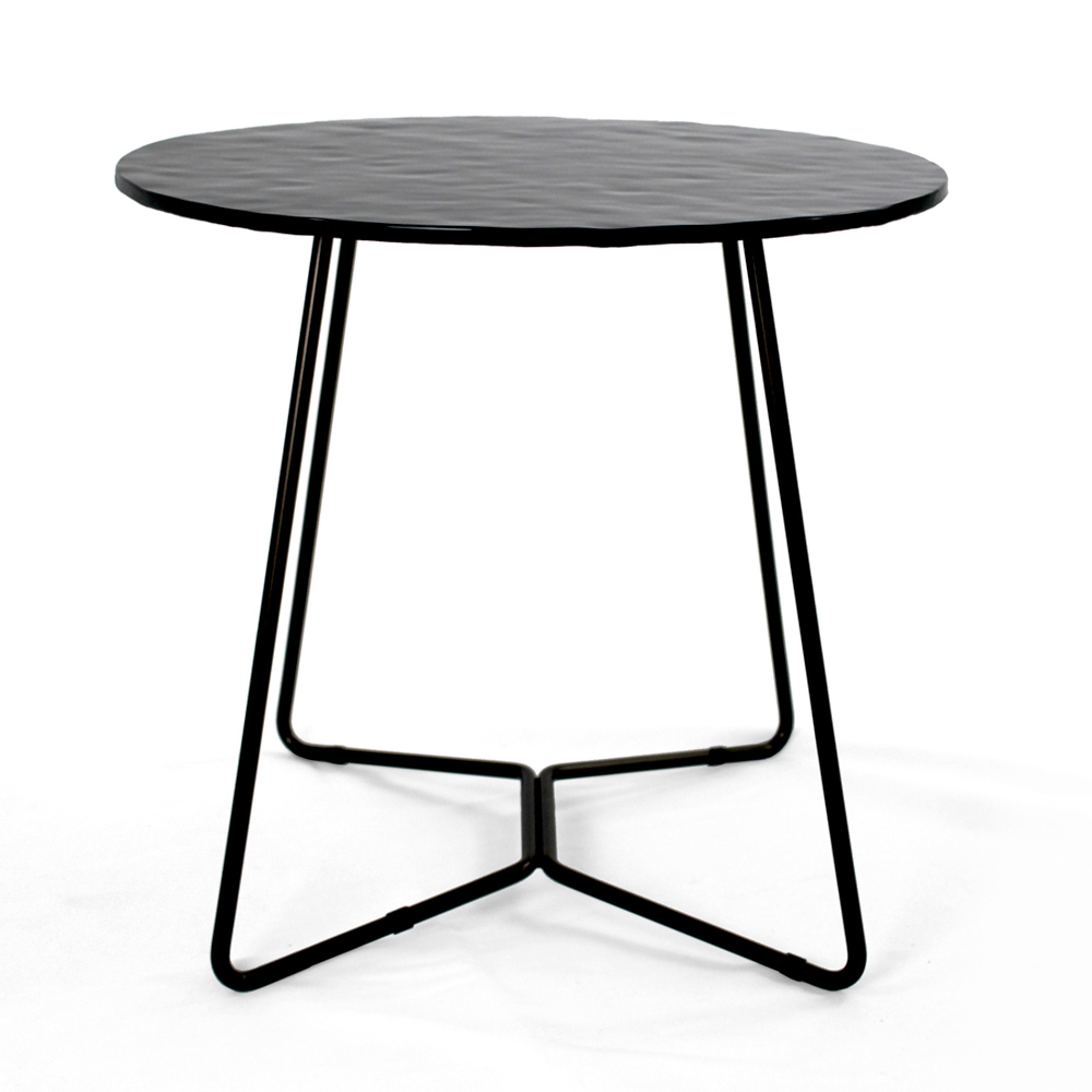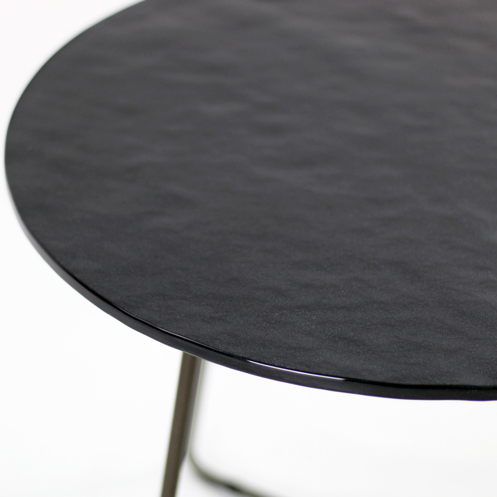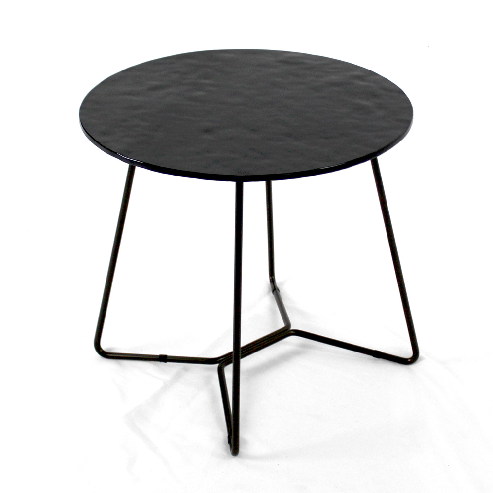 Tavolinë e rrumbullakët me bazë çeliku të lyer dhe majë xhami.