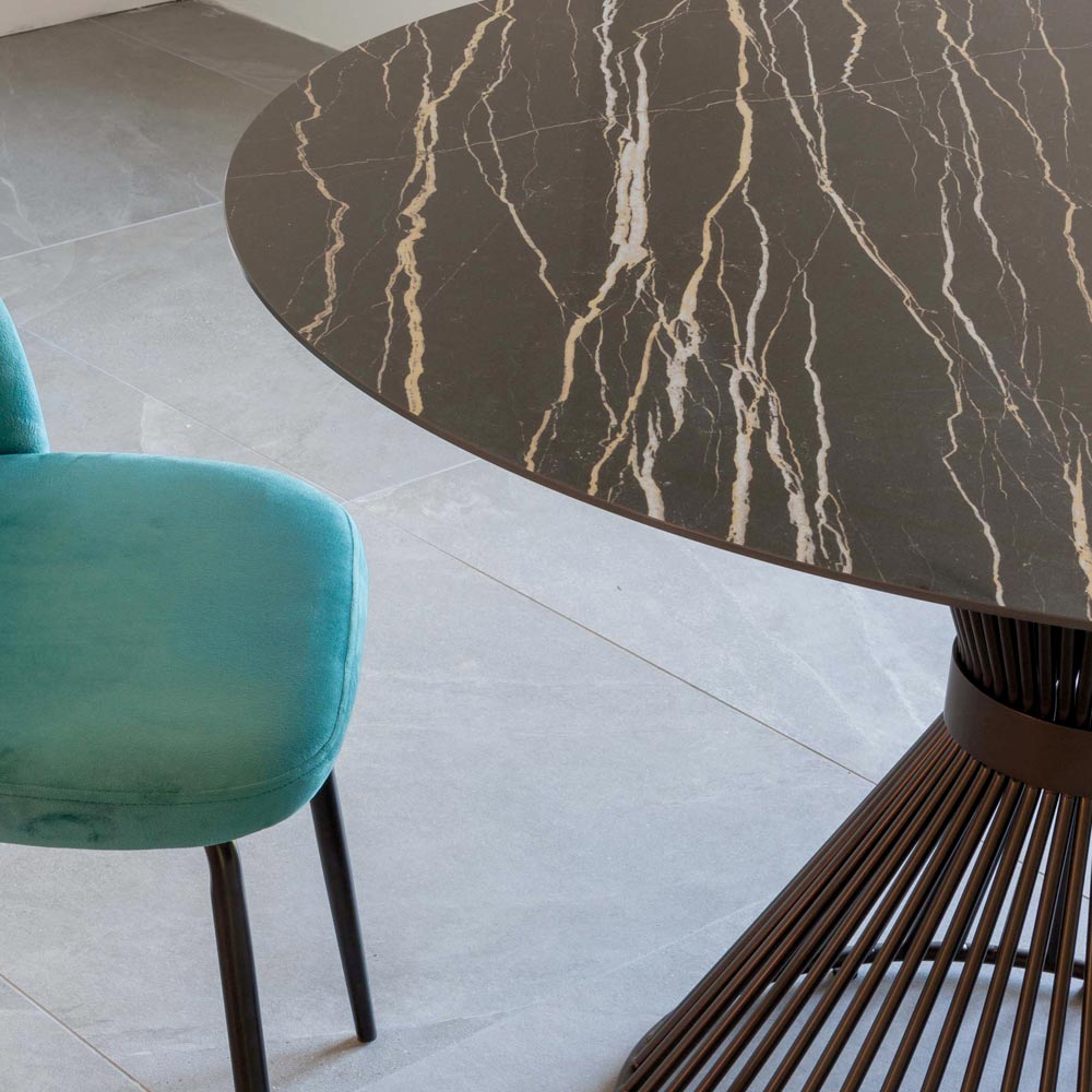 Tavolinë ngrënieje e rrumbullakët e punuar me majë qeramike me shkëlqim florim (6 mm qeramike + 18 mm melamine) dhe bazë prej çeliku të lyer me ngjyrë të zezë.