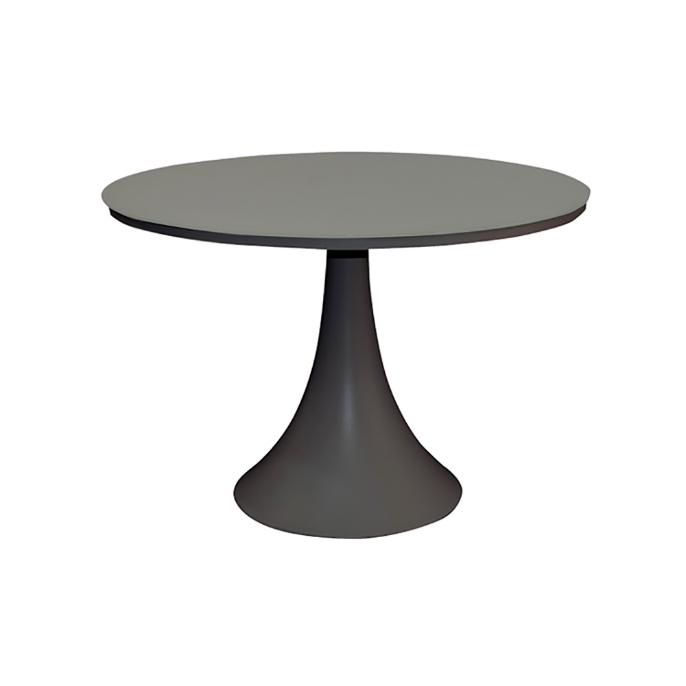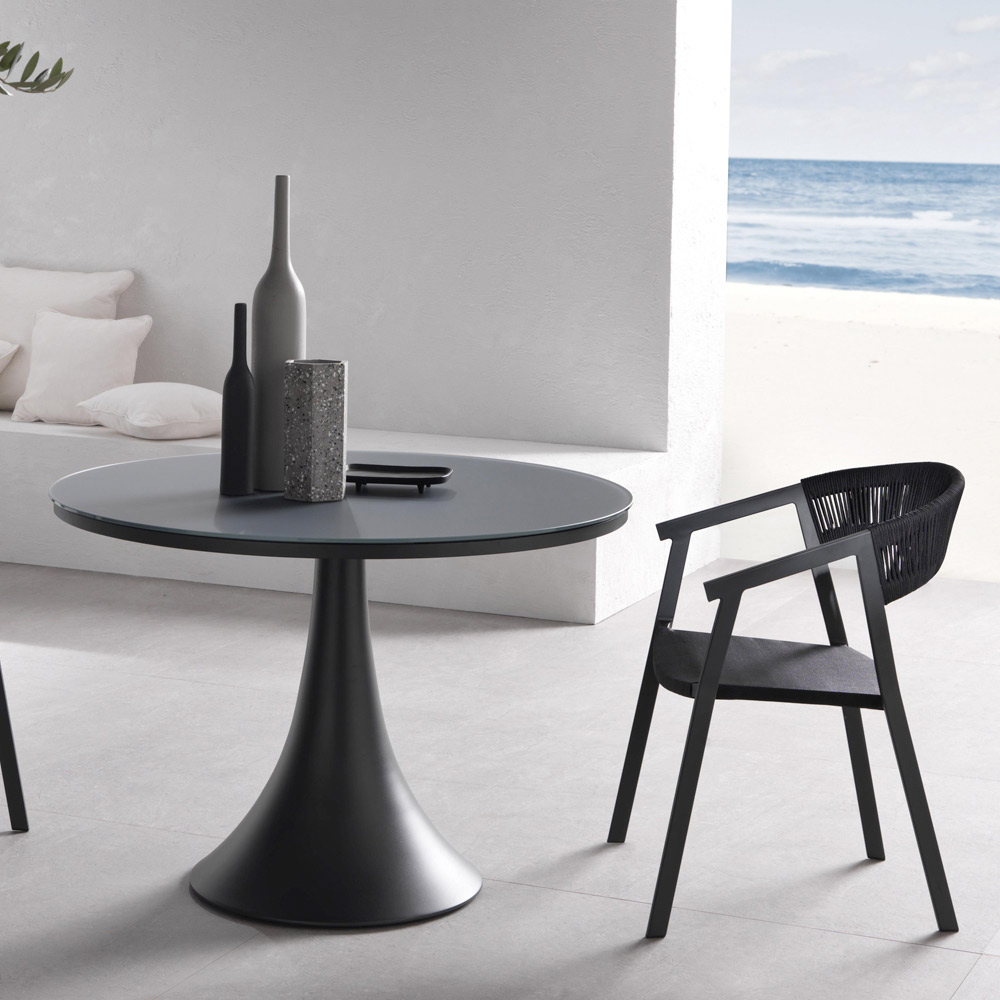 Tavolinë e rrumbullakët e kopshtit e bërë nga alumini i lyer me pluhur epoksid dhe pjesa e sipërme e xhamit të lyer .Format e ëmbla të kësaj tavoline përshtaten në mënyrë perfekte me çdo lloj ambienti të jashtëm, duke i dhënë asaj një karakter të fortë modern dhe personal . Materialet e tij cilësore janë bërë për të qenë rezistente dhe jetëgjatë.