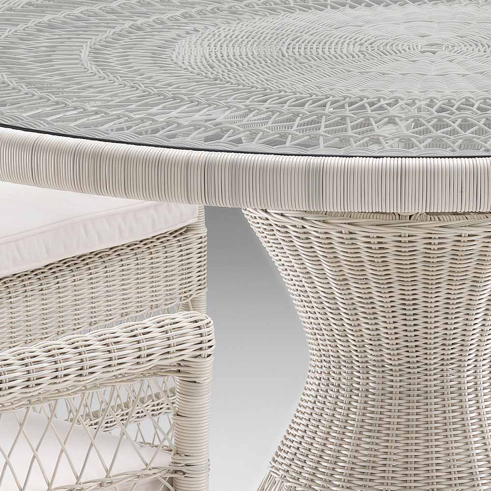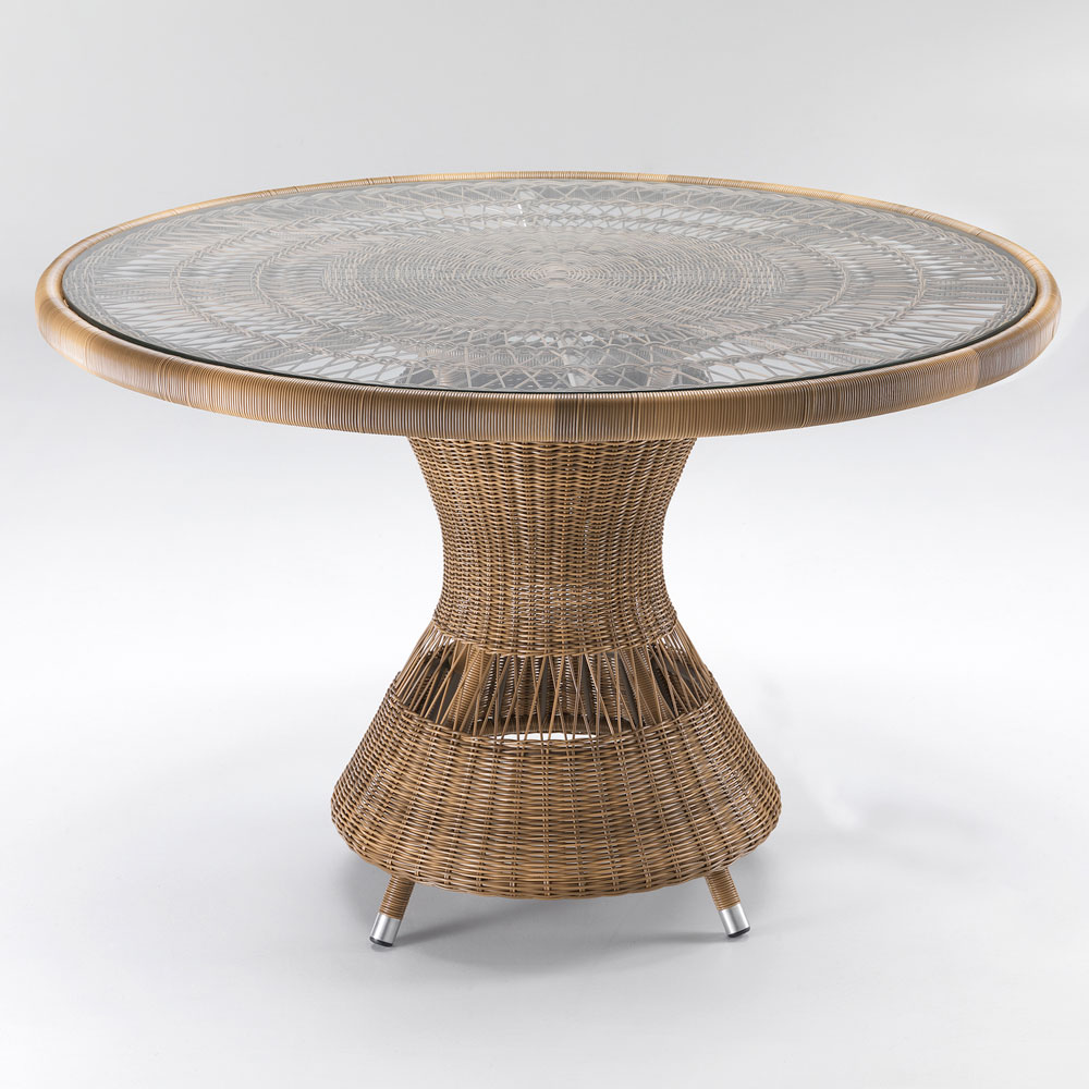 Tavolina e rrumbullakët e ngrënies Gigi ka një strukturë me një kornizë të bërë prej alumini të veshur me pluhur , mbi të cilën është endur me dorë nga mjeshtrit më ekspert në fibra Polyrattan e markës Rehau me cilësi të lartë me trashësi 3 mm. Përveç kësaj, tavolina është e pajisur me një majë xhami të trashë 8 mm , e cila lejon rozetën e endur me dorë të shkëlqejë.