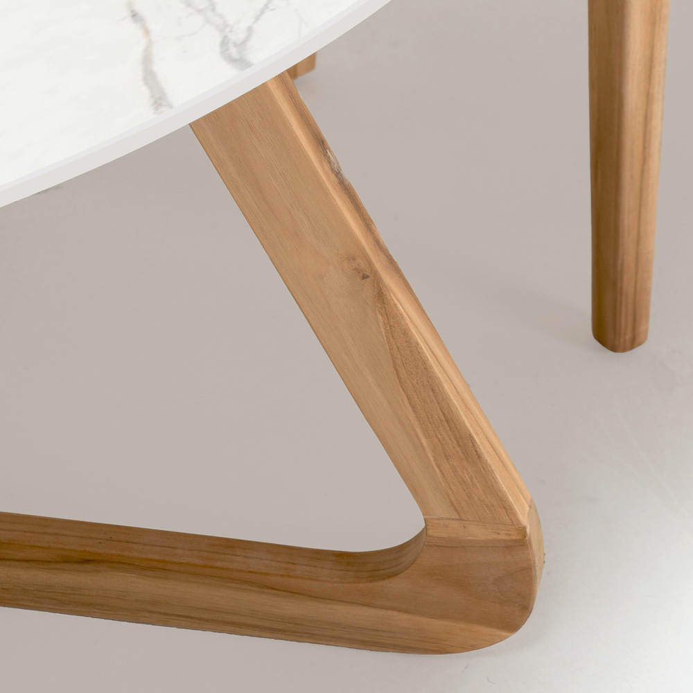 Baza prej druri jo vetëm që mbështet fort sipërfaqen e fortë prej qeramike të tavolinës, por gjithashtu shton një prekje ngrohtësie natyrale, duke krijuar një kontrast vizual magjepsës me sipërfaqen e shndritshme prej mermeri. Ky kombinim jo vetëm që është i këndshëm estetikisht , por ofron edhe qëndrueshmëri dhe rezistencë ndaj motit , duke e bërë tavolinën ideale për përdorim të përditshëm në natyrë.