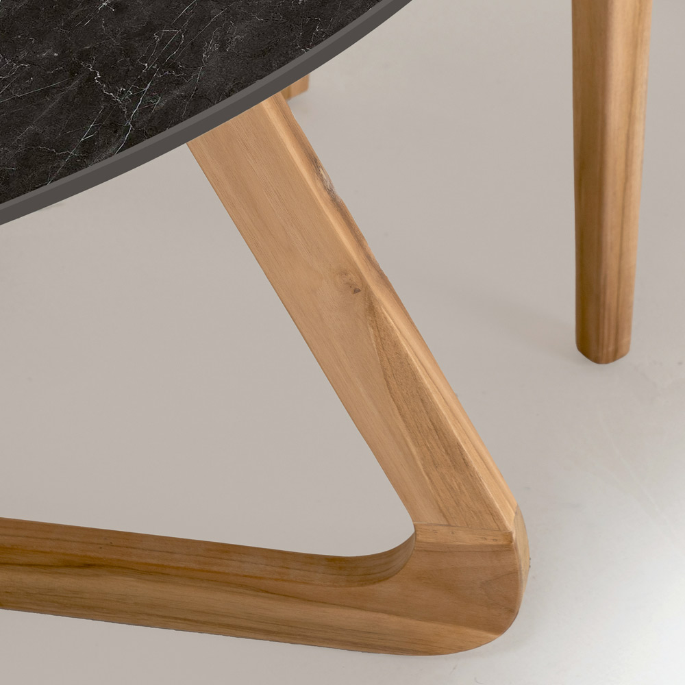 Baza prej druri plotëson dizajnin me një ndjesi ngrohtësie dhe elegance natyrale, duke ofruar një kontrast harmonik me sipërfaqen e ndritshme dhe të sofistikuar të tavolinës. Kombinimi i materialeve nuk është vetëm estetikisht i këndshëm , por është ndërtuar edhe për të siguruar qëndrueshmëri dhe stabilitet në një sërë mjedisesh të jashtme.