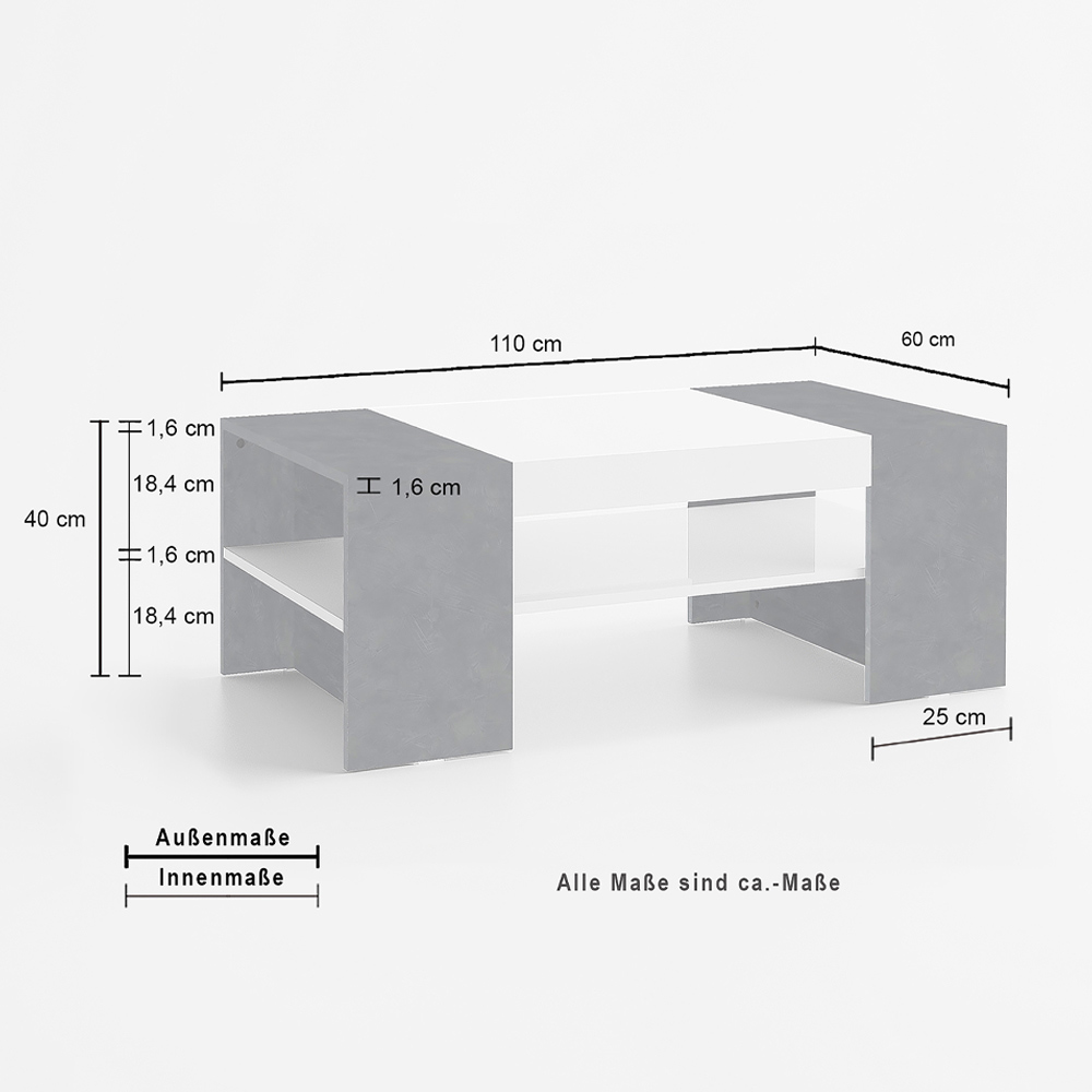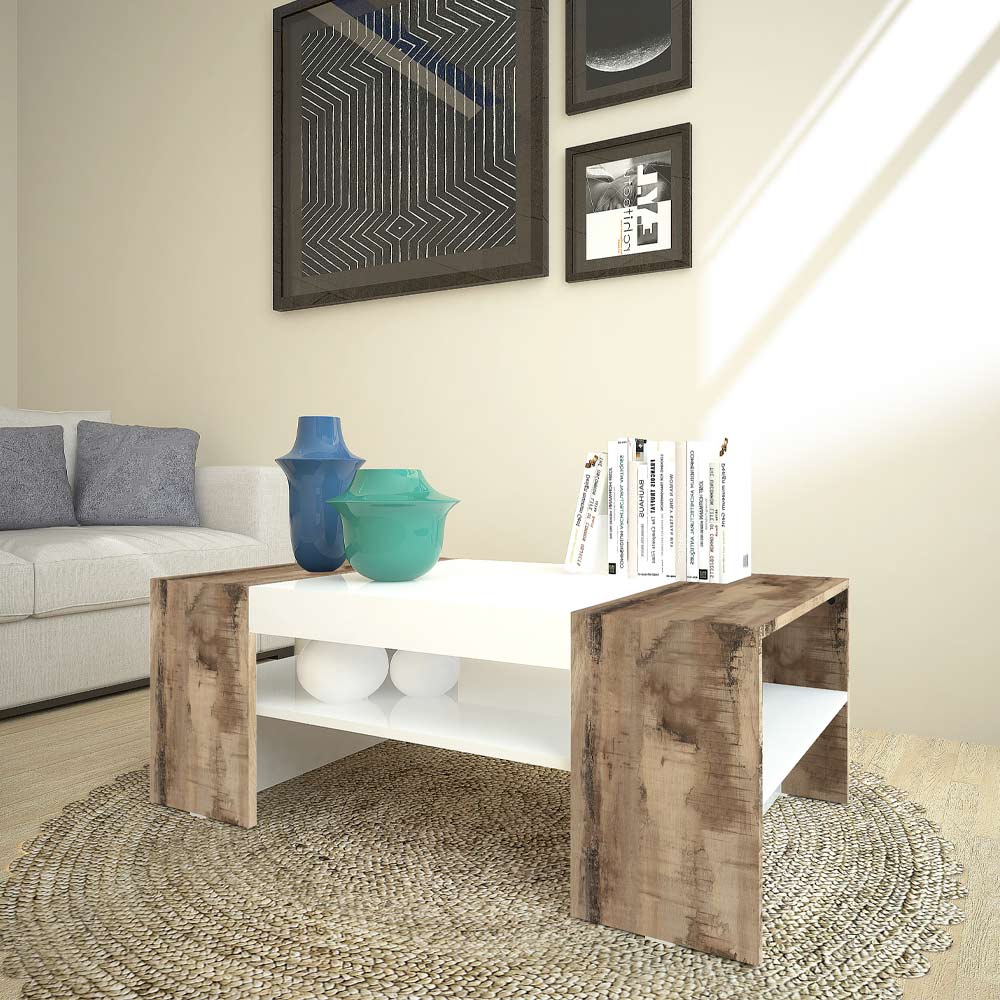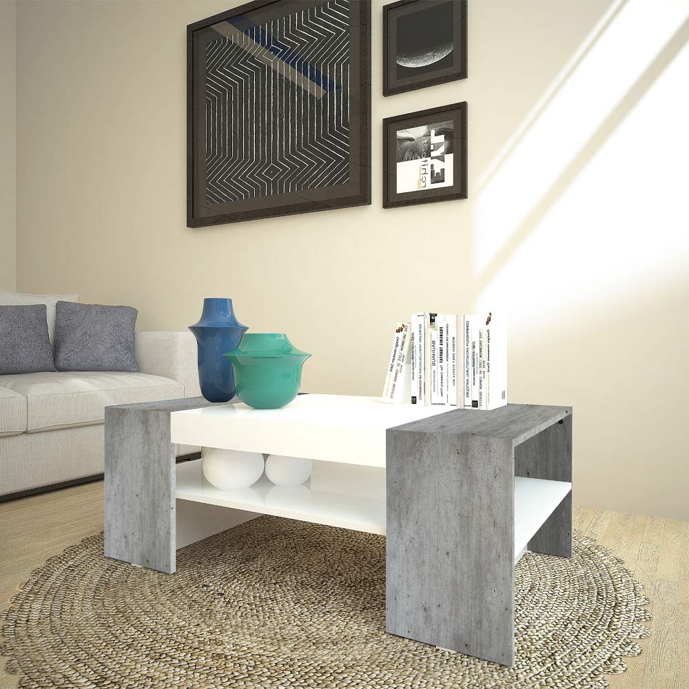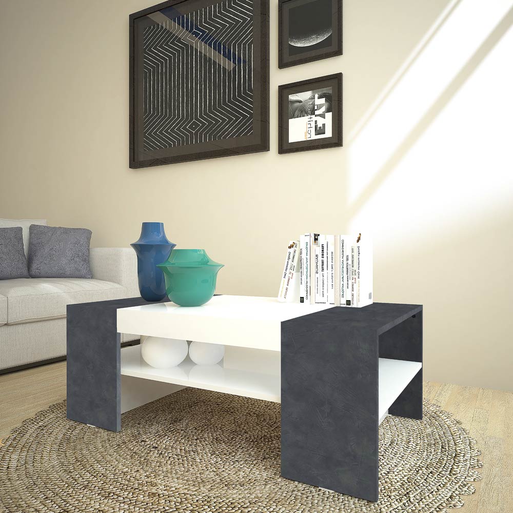 Tavolina e kafesë për dhomën e ndenjes ka një dizajn elegant, minimal dhe gjeometrik të bërë me dy majë në dru të bardhë me shkëlqim të qëndrueshëm me llak dhe një strukturë të madhe mbështetëse të disponueshme në 3 përfundime.