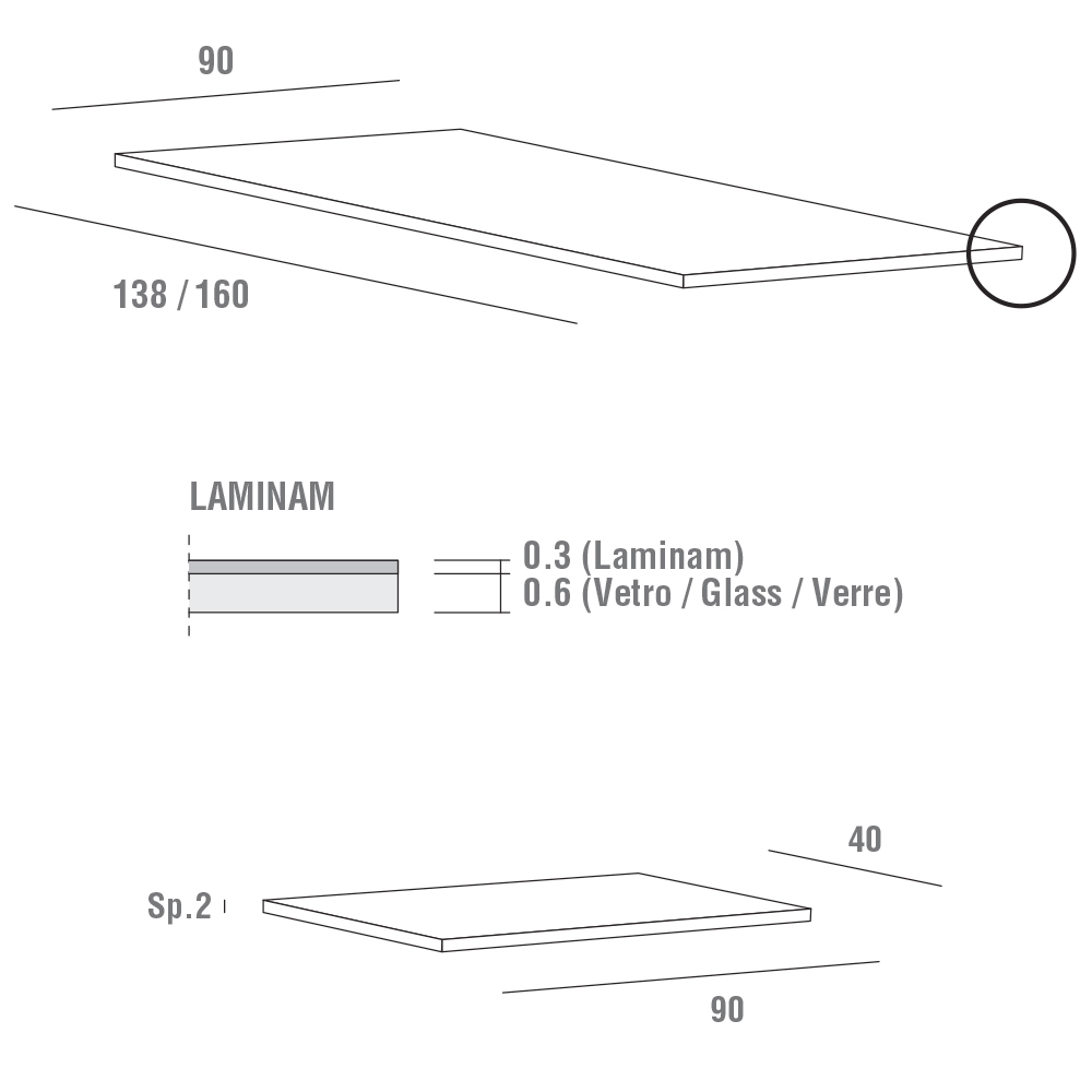 - L 160/200/240 x D 90 x H 76,5 cm.