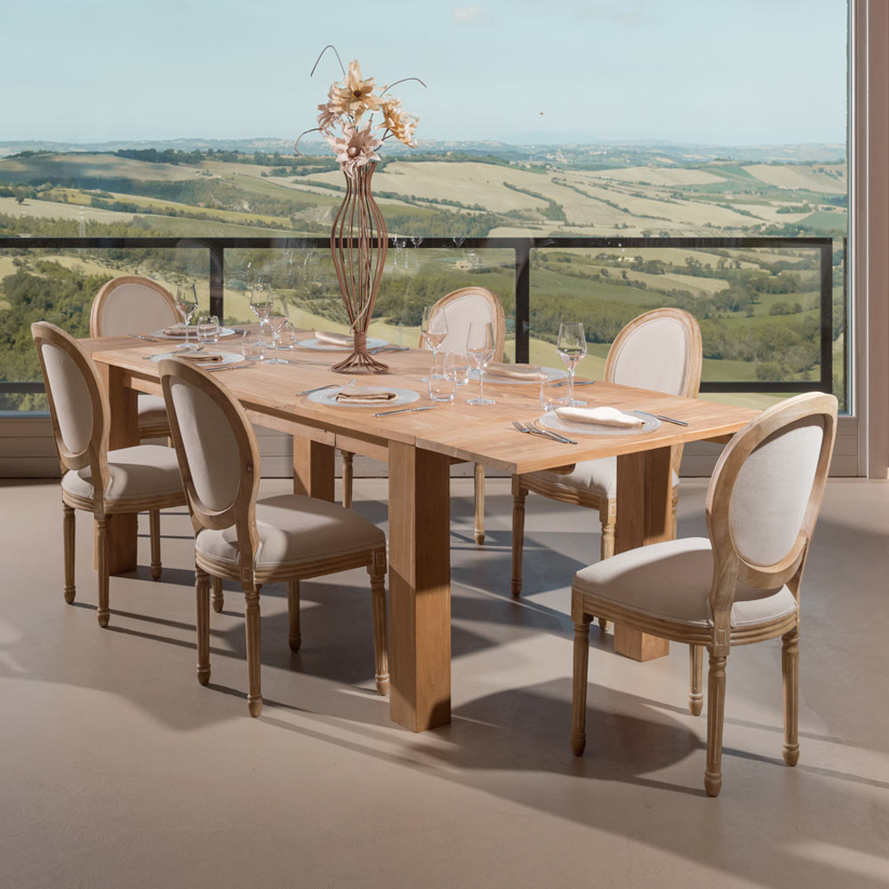 Kjo tavolinë e zgjatshme prej druri të fortë tik është një zgjidhje praktike dhe elegante për mobilimin, ideale për dhomën e ngrënies ose kuzhinën. Struktura dhe mjeshtëria e fortë nxjerrin në pah fibrat natyrale të drurit , duke i dhënë ngrohtësi dhe karakter hapësirës.