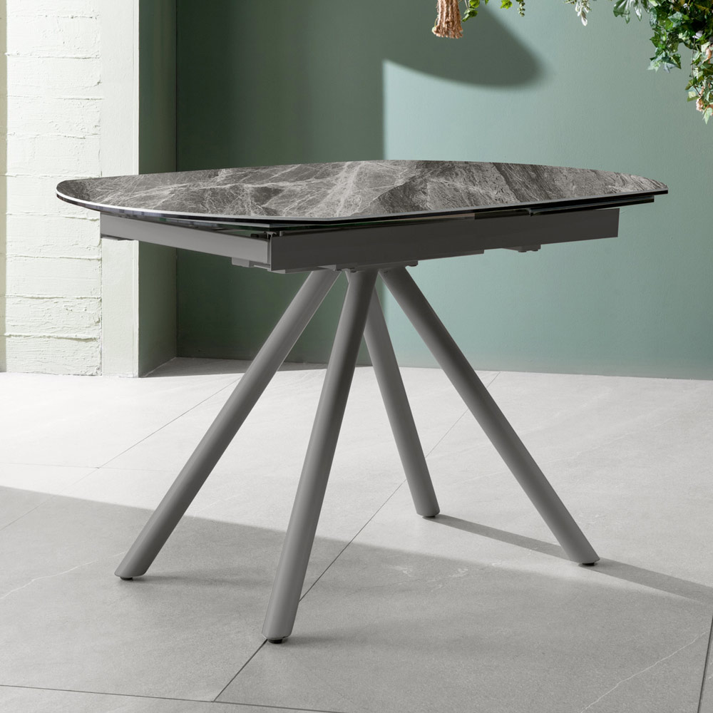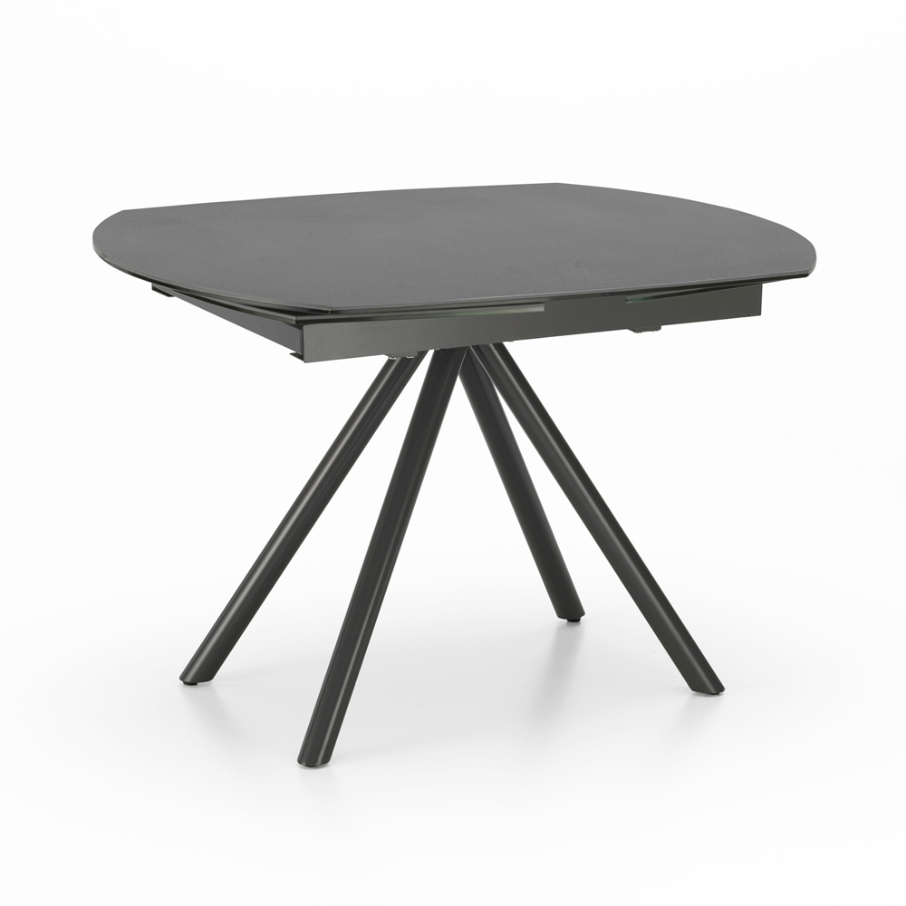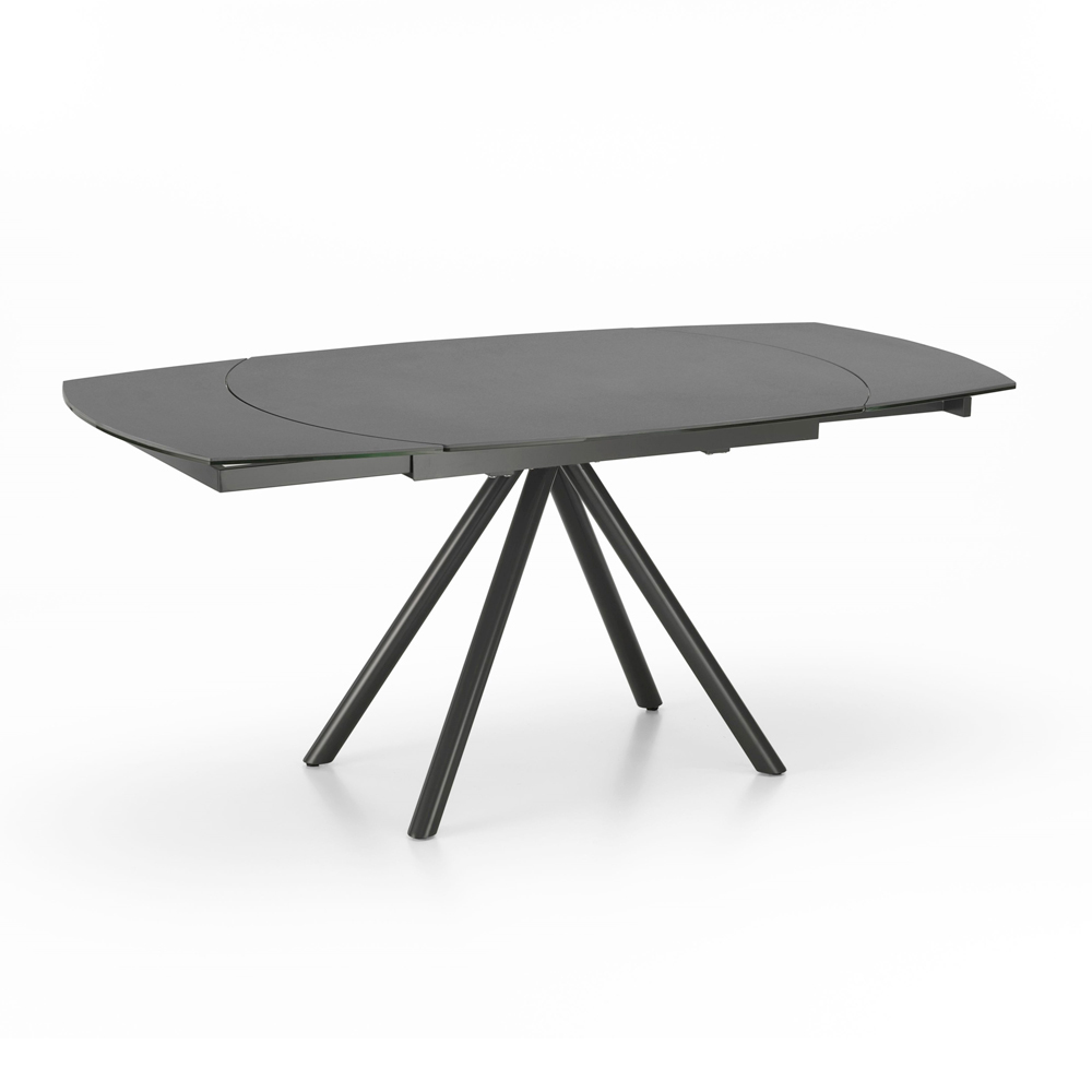 Tavolinë e zgjatur e dhomës së ndenjes me majë qeramike (5 mm) në xham të kalitur (8 mm), këmbë metalike të lyera me antracit dhe zgjatime të brendshme në qeramikë në xham të kalitur. Elegant, praktik dhe funksional, ky artikull mund të kombinohet në mënyrë perfekte me çdo stil, si në kuzhinë ashtu edhe në dhomën e ndenjes. Falë mundësisë së zgjatjes është ideale për plotësimin e nevojave të ndryshme të përdorimit për të ftuar miq dhe të afërm. Për më tepër, materialet e përdorura për ndërtim garantojnë cilësi dhe rezistencë edhe me kalimin e kohës.