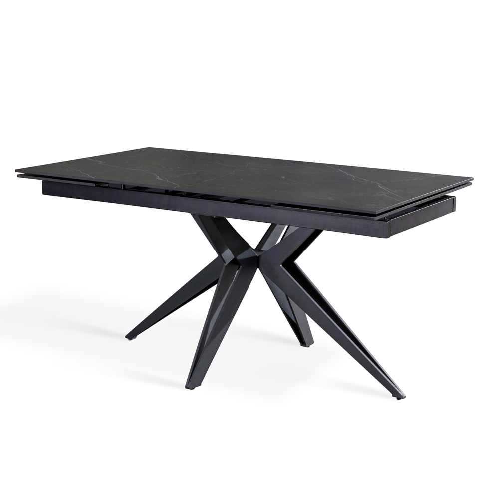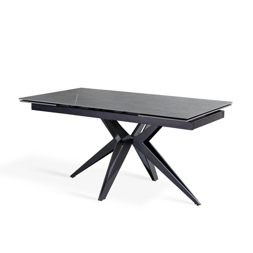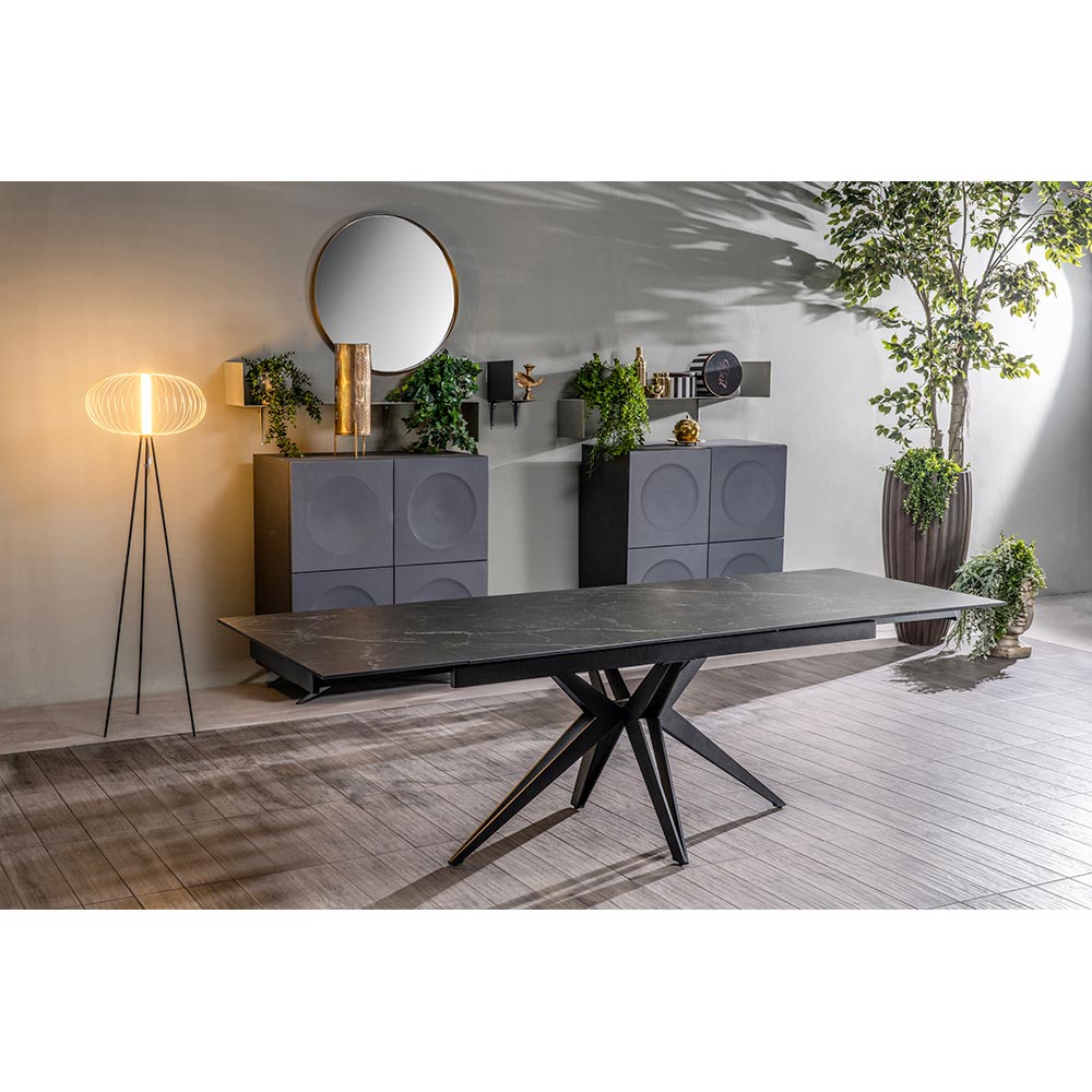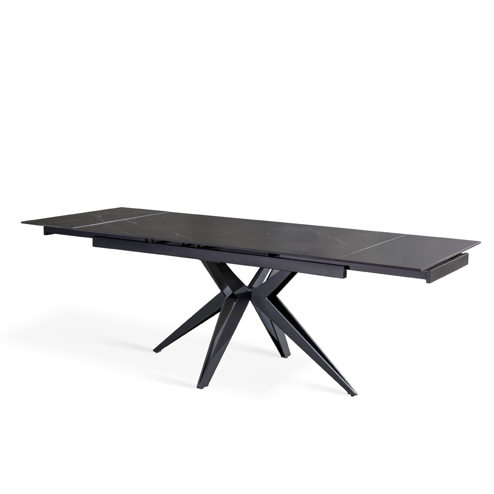 Tavolinë e zgjatur e dhomës së ndenjes me majë qeramike , këmbë metalike me yje dhe zgjatime qeramike të anulueshme.