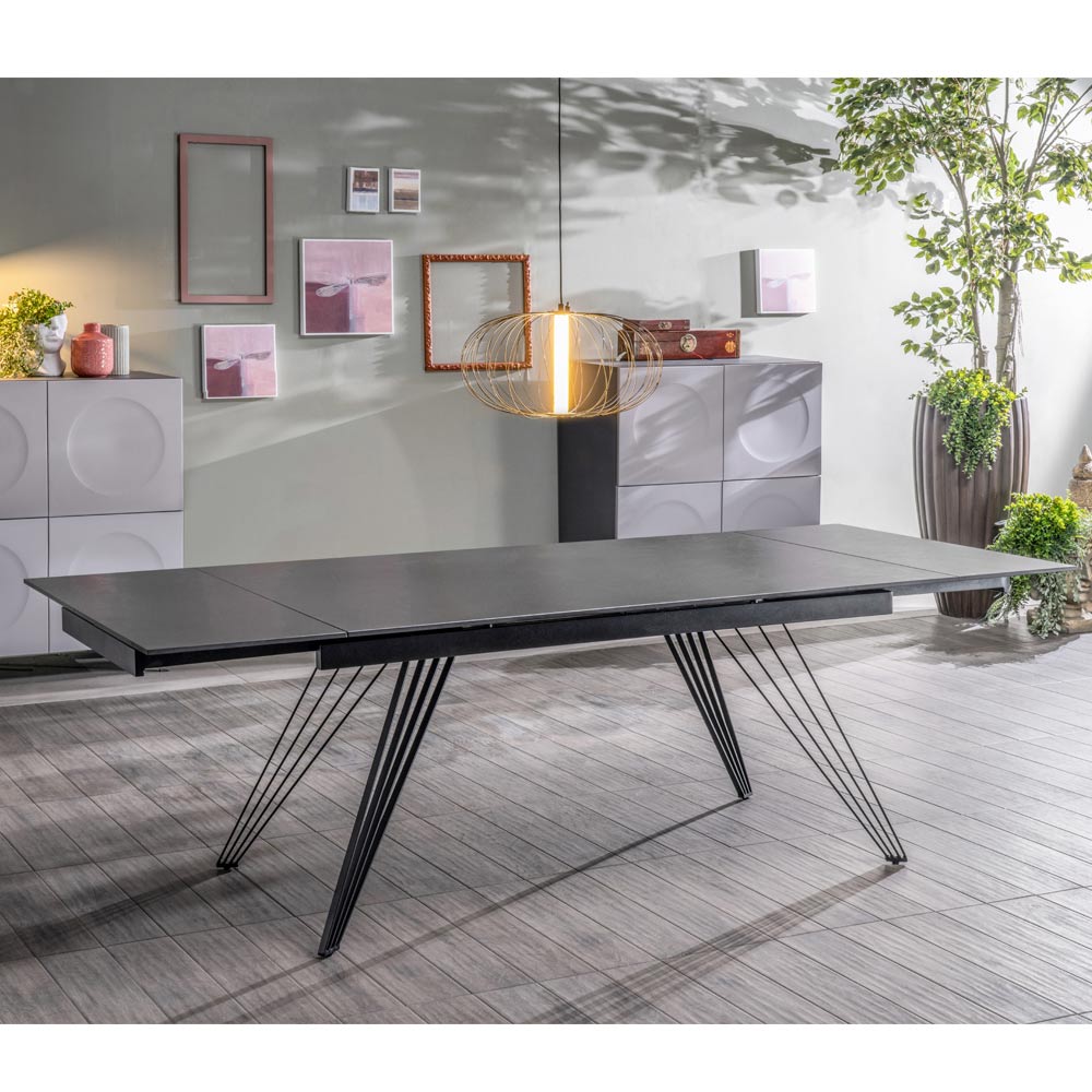 Ajo që tërheq vëmendjen është forca shprehëse e kësaj tavoline të zgjatur në një stil bashkëkohor dhe industrial. Dizajni i tij karakterizohet nga pjesa e sipërme elegante e bërë nga qeramika e cila përputhet me shije me bazën e fortë metalike. Ofron shumë kombinime të mundshme midis përfundimeve të pjesës së sipërme drejtkëndore dhe përfundimit të bazës, duke kënaqur shprehjen dhe shijen personale dhe duke reflektuar frymën e kontekstit në të cilin është futur. Falë shtrirjes së tij, ai mund të strehojë deri në 10 persona dhe bëhet aleati i përsosur në krijimin e hapësirave unike dhe të ngrohta komode.