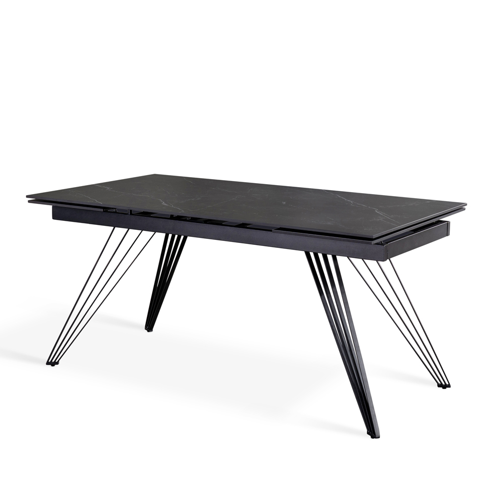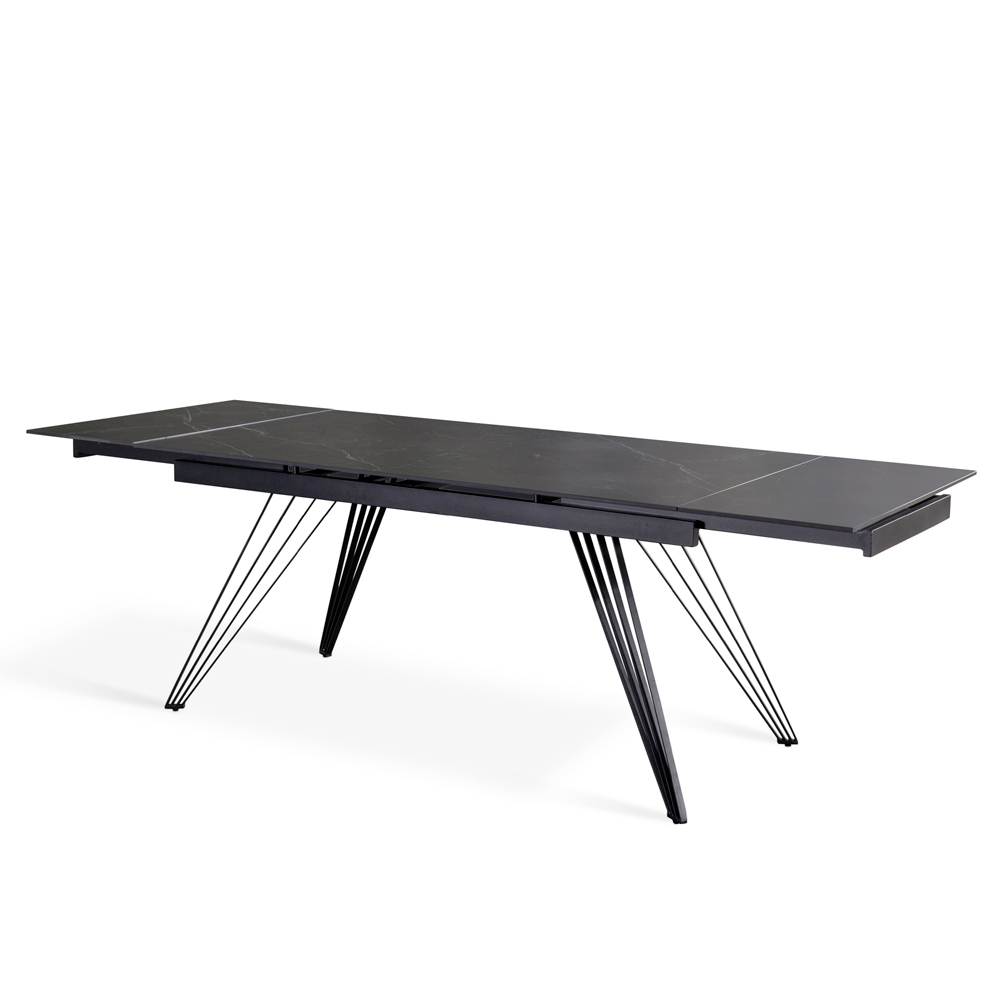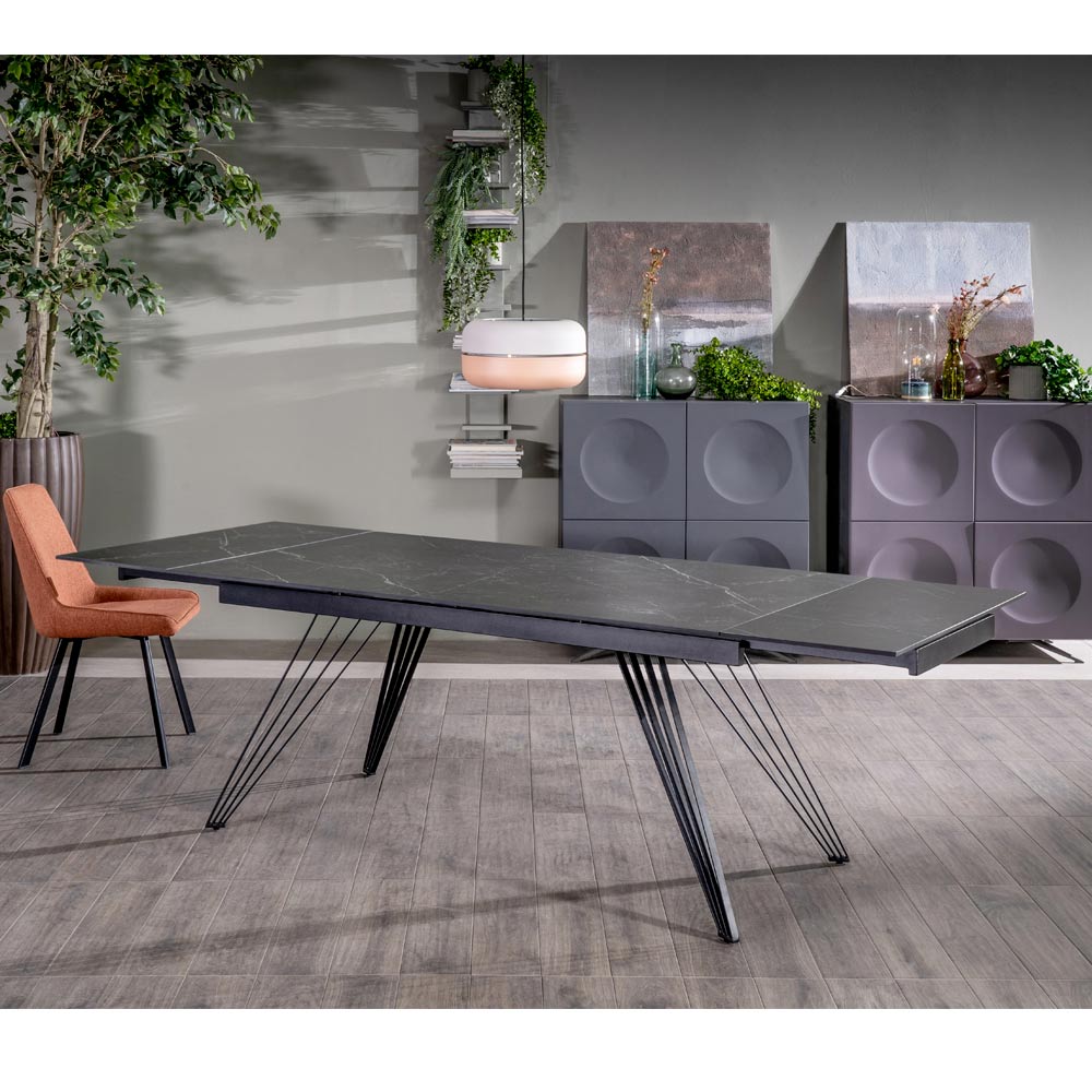 Tavolinë e zgjatur e dhomës së ndenjes me majë qeramike , këmbë metalike radiale dhe zgjatime qeramike të anulueshme.