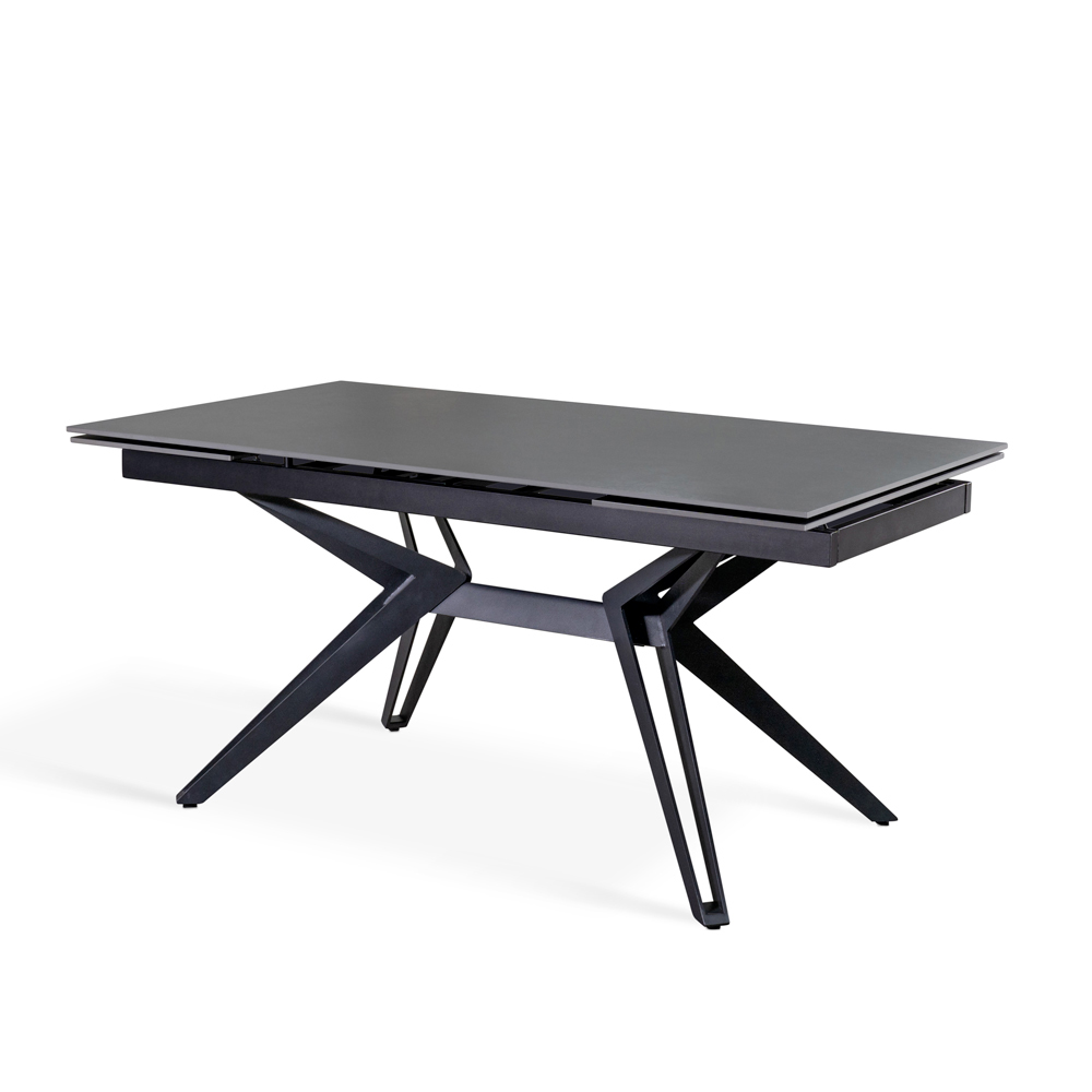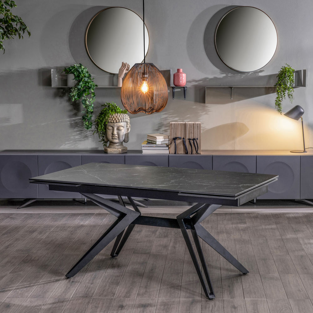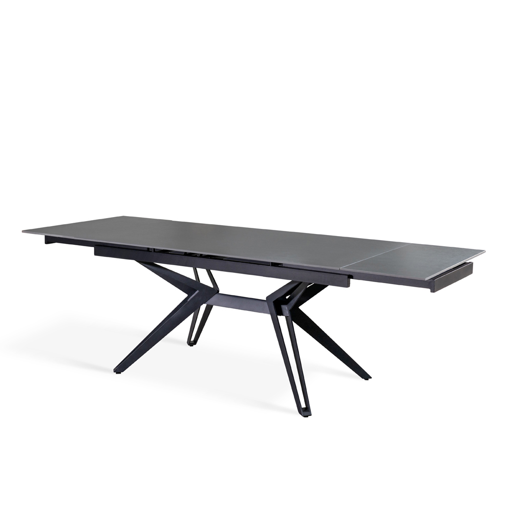 Ajo që tërheq vëmendjen është forca shprehëse e kësaj tavoline të zgjatur në një stil bashkëkohor dhe industrial. Dizajni i tij karakterizohet nga pjesa e sipërme elegante e bërë nga qeramika e cila përputhet me shije me bazën e fortë metalike. Ofron shumë kombinime të mundshme midis përfundimeve të pjesës së sipërme drejtkëndore dhe përfundimit të bazës, duke kënaqur shprehjen dhe shijen personale dhe duke reflektuar frymën e kontekstit në të cilin është futur. Falë shtrirjes së tij, ai mund të strehojë deri në 10 persona dhe bëhet aleati i përsosur në krijimin e hapësirave unike dhe të ngrohta komode.