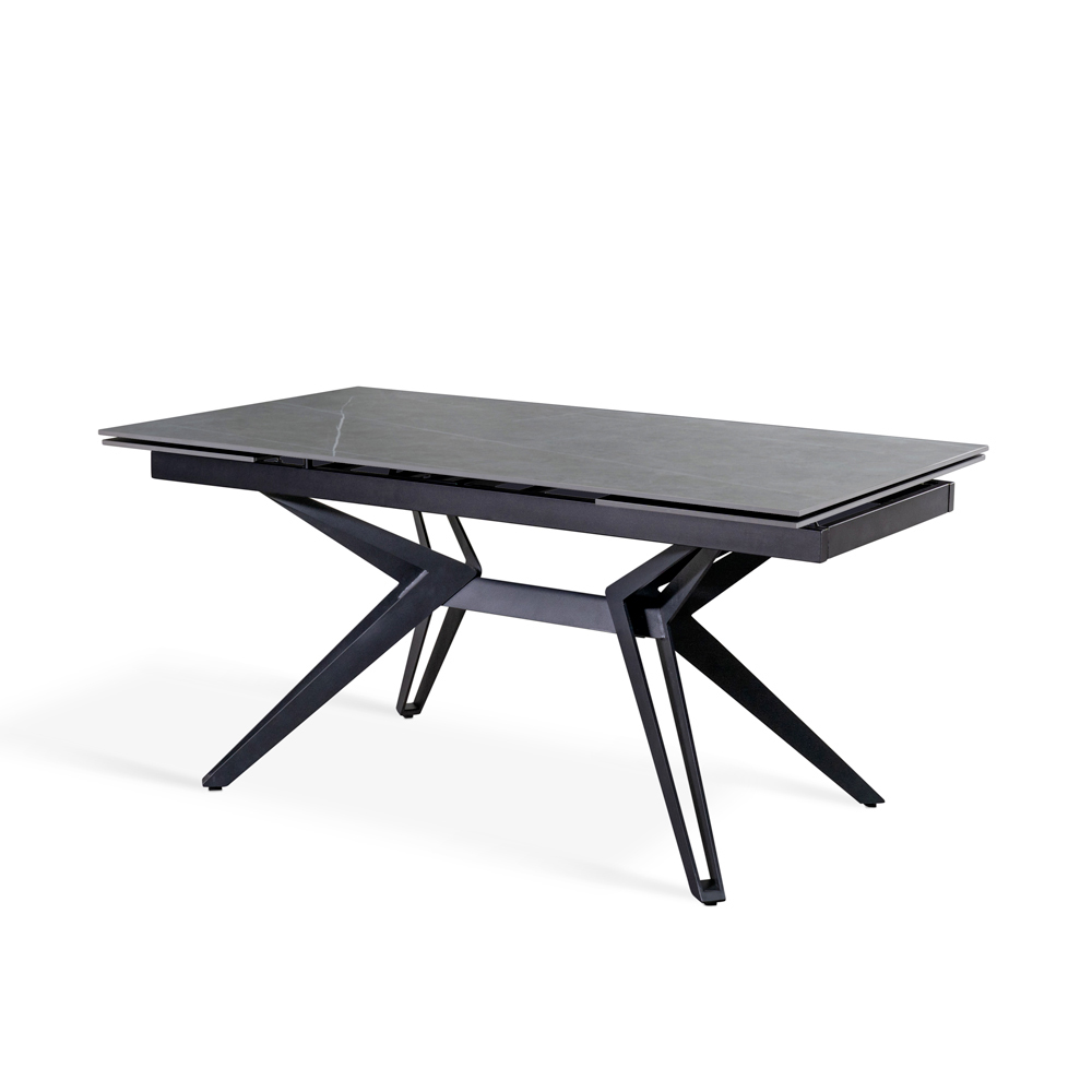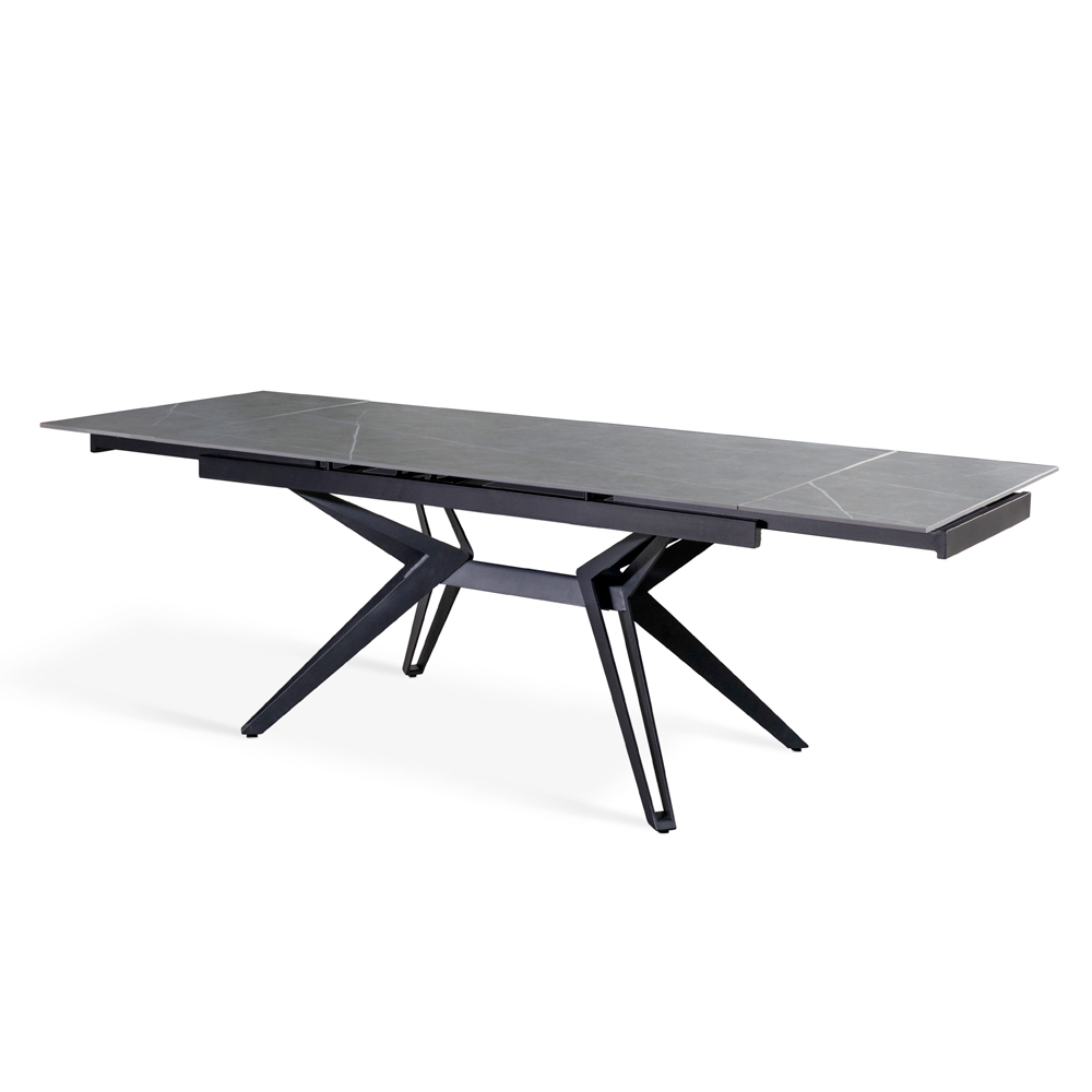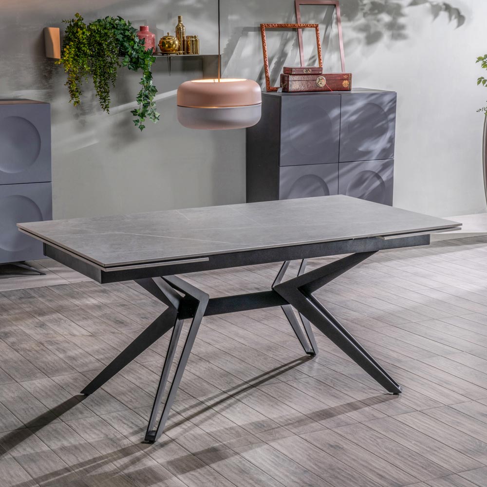Tavolinë e zgjatur e dhomës së ndenjes me majë qeramike , këmbë metalike me yje dhe zgjatime qeramike të anulueshme.