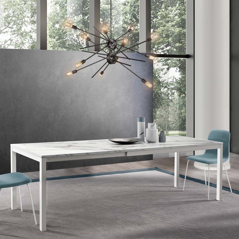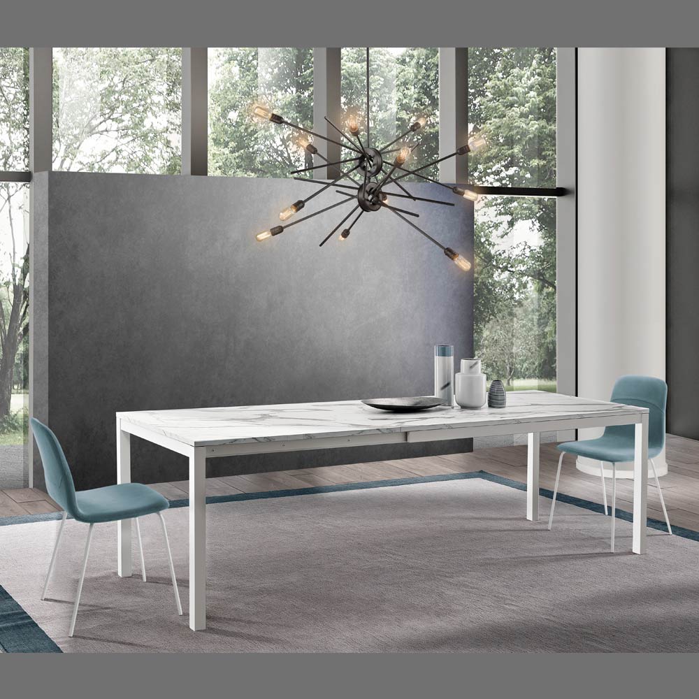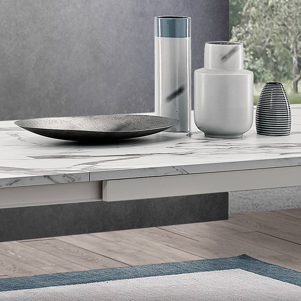 Këtu është një tavolinë ngrënieje që feston shkëlqimin dhe pastërtinë e dizajnit modern. Me një sipërfaqe melamine mahnitëse me efekt calacatta , kjo pjesë lartëson çdo dhomë, duke kombinuar qëndrueshmërinë e materialit me lehtësinë vizuale të ofruar nga këmbët e bardha metalike . Pamja është e pastër, minimale, por e pasur në detaje, si p.sh. kokrriza delikate dhe natyrale që kalon në mënyrë delikate në të gjithë sipërfaqen, duke ofruar një kombinim perfekt të funksionalitetit dhe estetikës së sofistikuar.