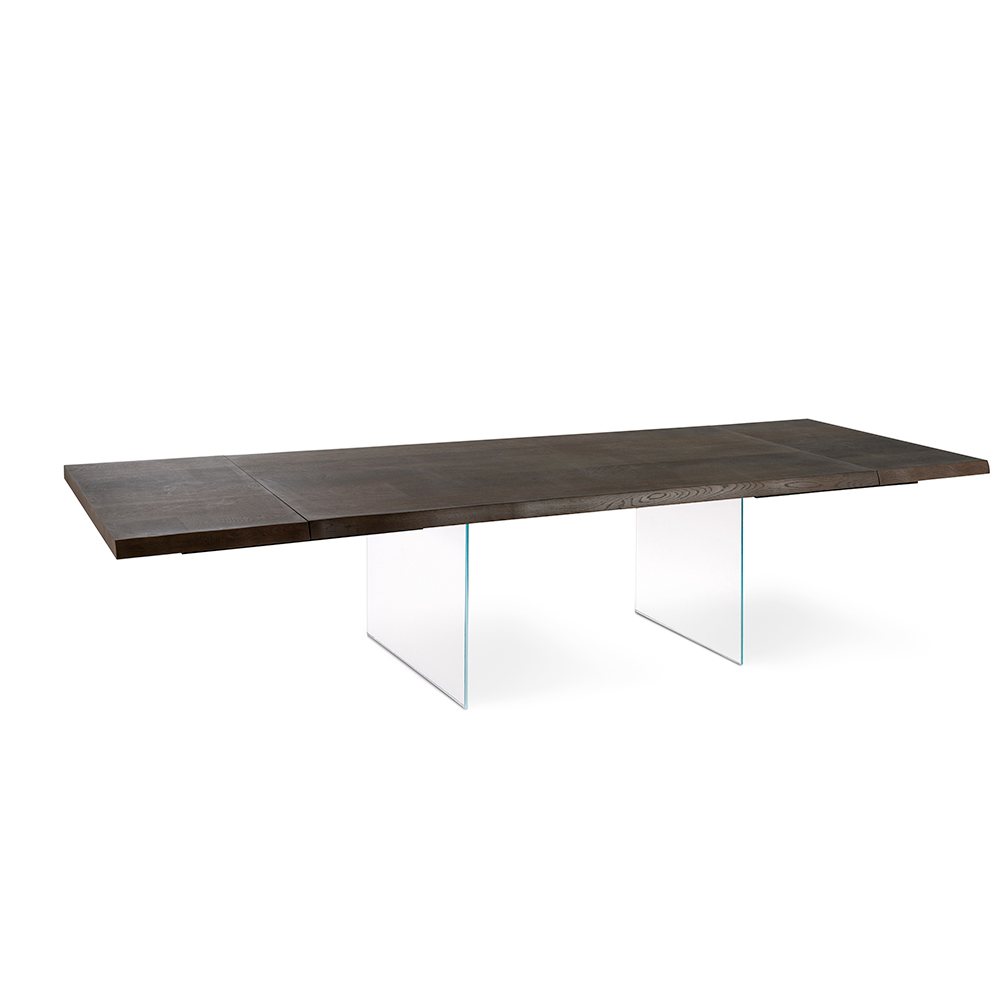 Tavolinë e zgjerueshme e dhomës së ndenjes me majë lisi të rimesuar , këmbë ekstra transparente prej xhami dhe zgjatime të jashtme me rimeso.