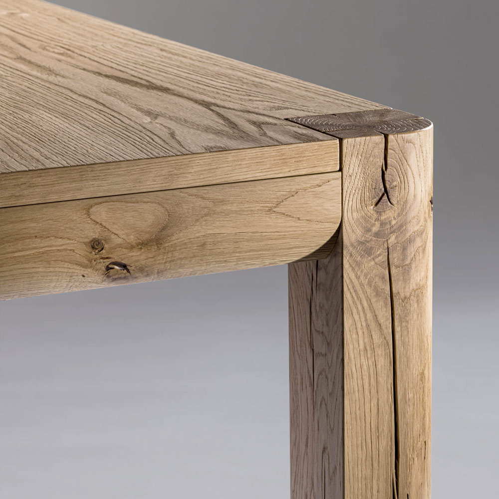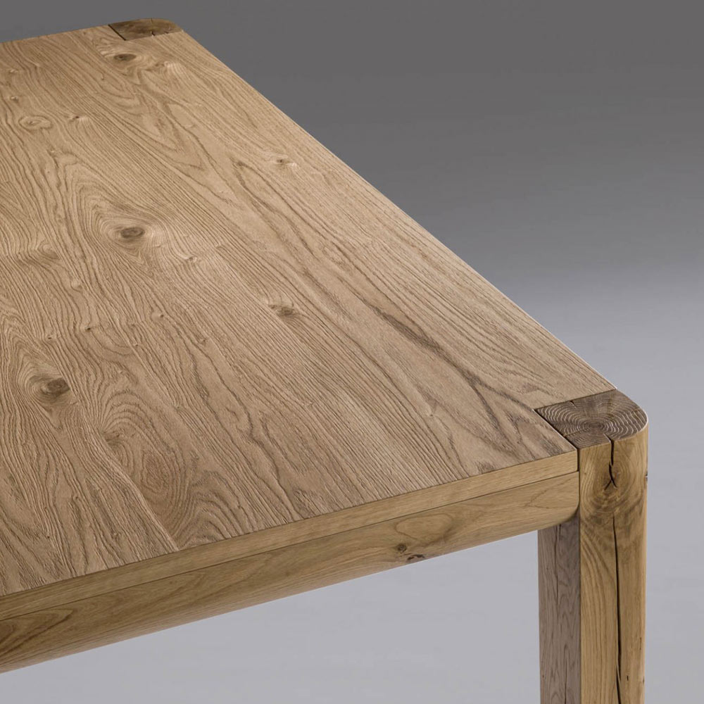 Tavolinë e zgjerueshme me pjesën e sipërme të bllokut të rimesuar prej lisi natyral dhe këmbë të forta katrore me të çara dhe nyje12 x 12 cm. Përmasat H 77 cm, trashësia 3 cm. Shtesat janë të përfshira .