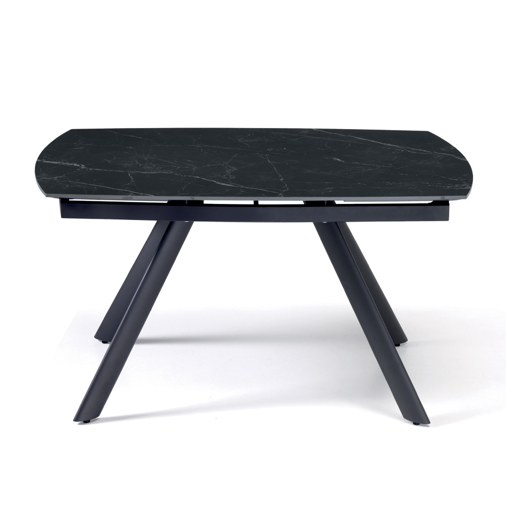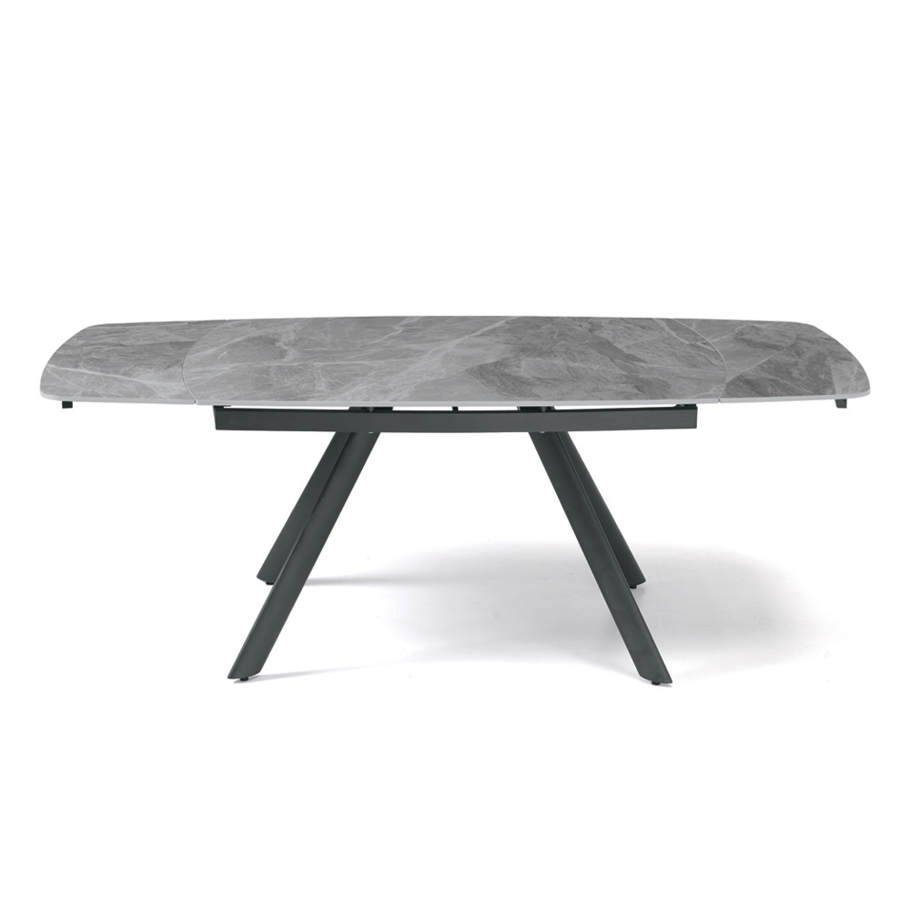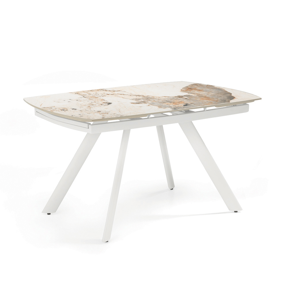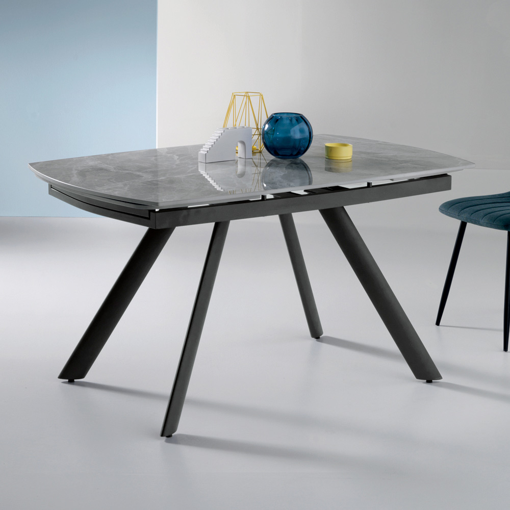 Tavolinë ngrënieje elegante e zgjerueshme me një dizajn modern, ideale për të mobiluar me stil dhomën tuaj të ngrënies ose dhomën e ndenjes . Sipërfaqja prej guri të sintezuar me efekt mermeri ofron një sipërfaqe të rafinuar, të qëndrueshme dhe të lehtë për t'u pastruar, perfekte për përdorim të përditshëm. Baza metalike e lyer i jep stabilitet dhe soliditet strukturës, duke krijuar një ekuilibër të përsosur midis estetikës bashkëkohore dhe funksionalitetit.
