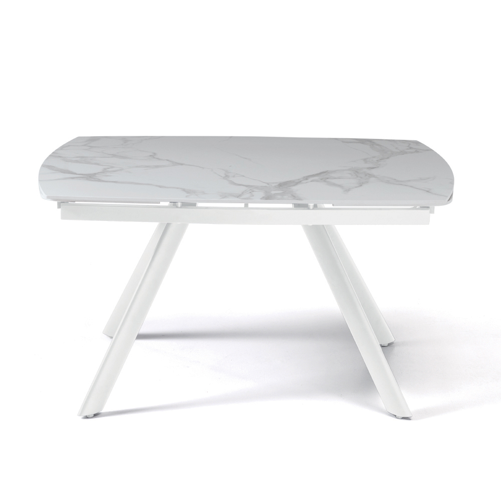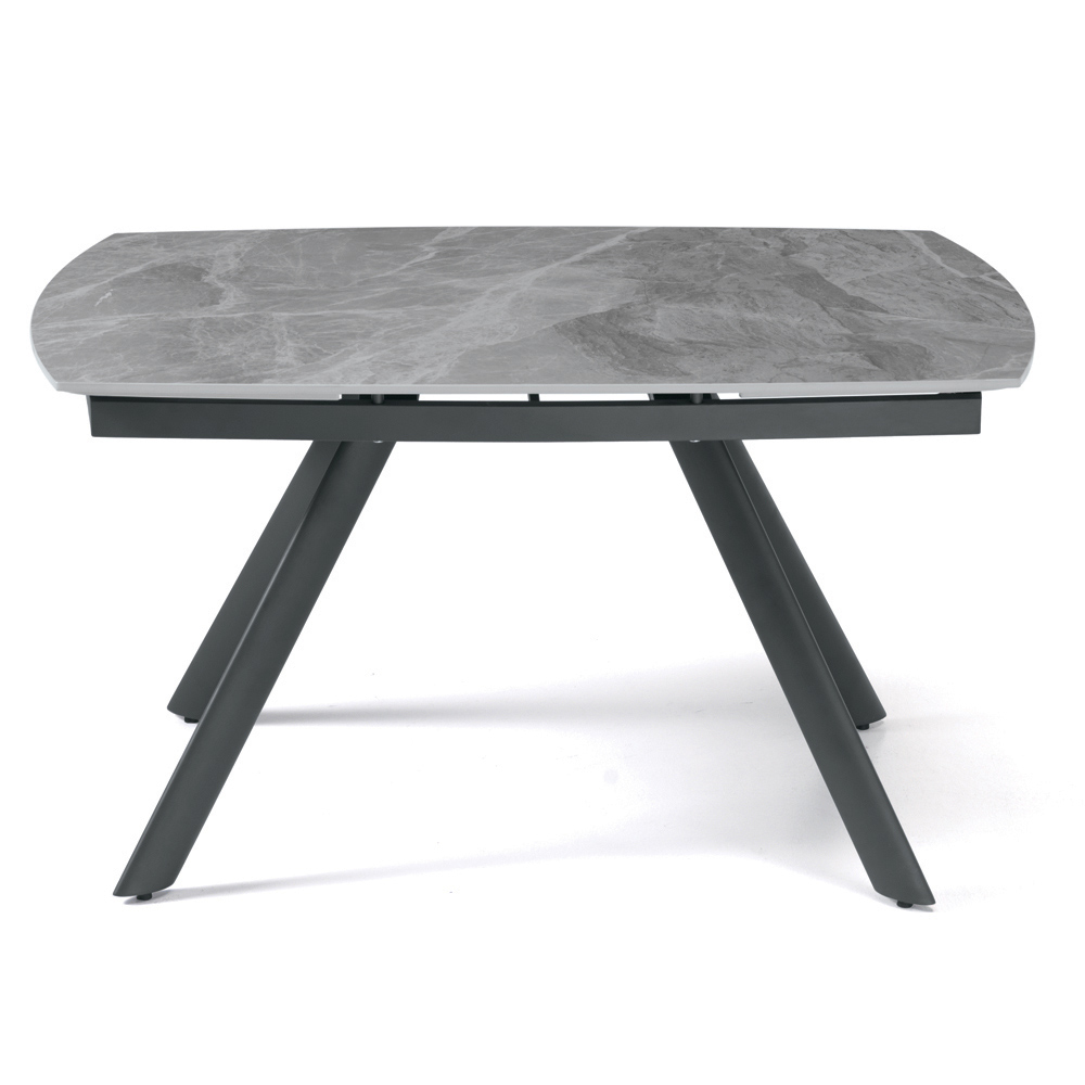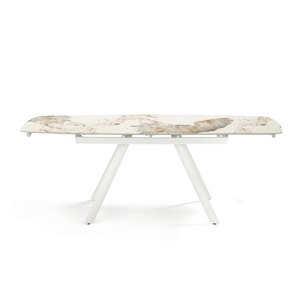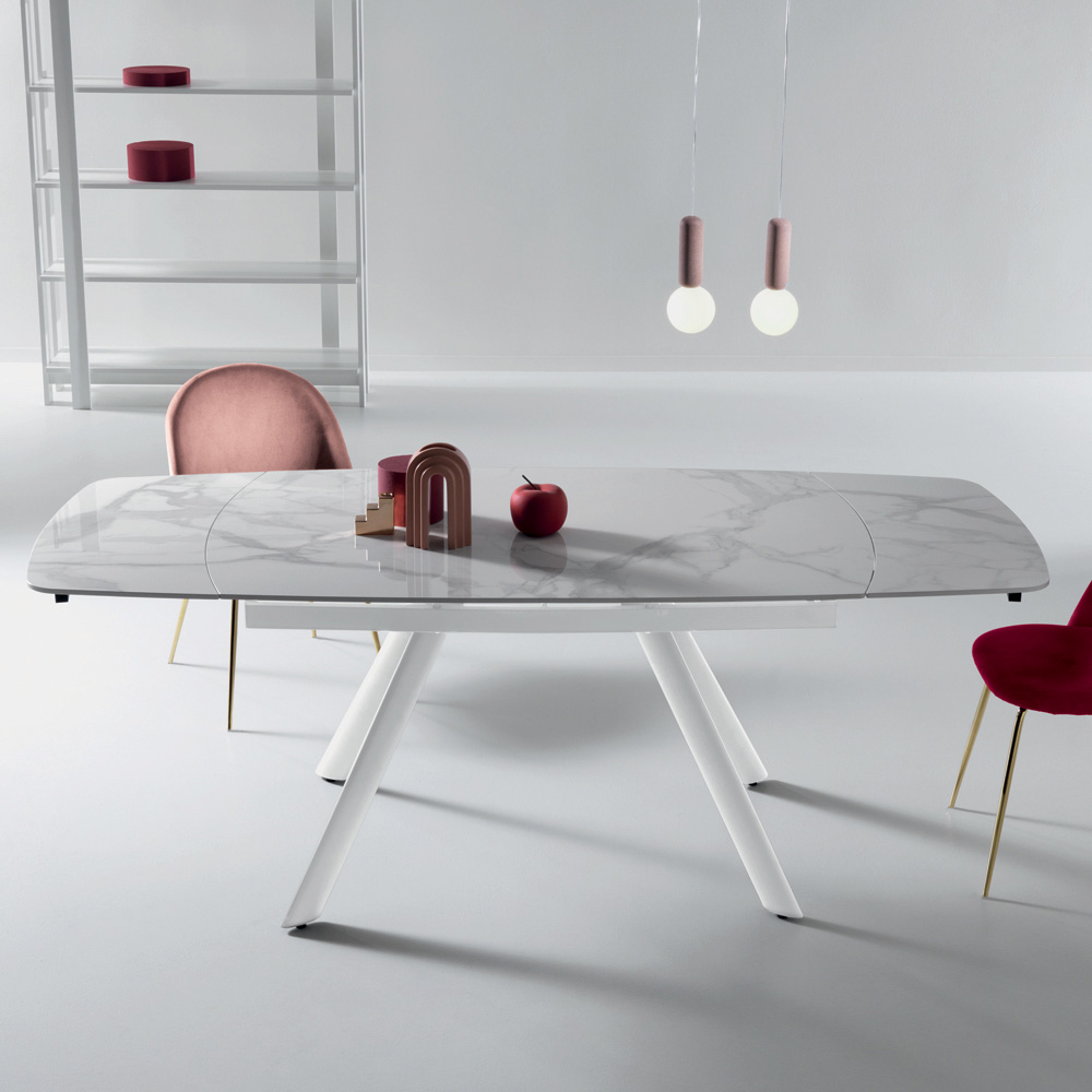 Tavolinë ngrënieje elegante e zgjerueshme me një dizajn modern, ideale për të mobiluar me stil dhomën tuaj të ngrënies ose dhomën e ndenjes . Sipërfaqja prej guri të sintezuar me efekt mermeri ofron një sipërfaqe të rafinuar, të qëndrueshme dhe të lehtë për t'u pastruar, perfekte për përdorim të përditshëm. Baza metalike e lyer i jep stabilitet dhe soliditet strukturës, duke krijuar një ekuilibër të përsosur midis estetikës bashkëkohore dhe funksionalitetit.