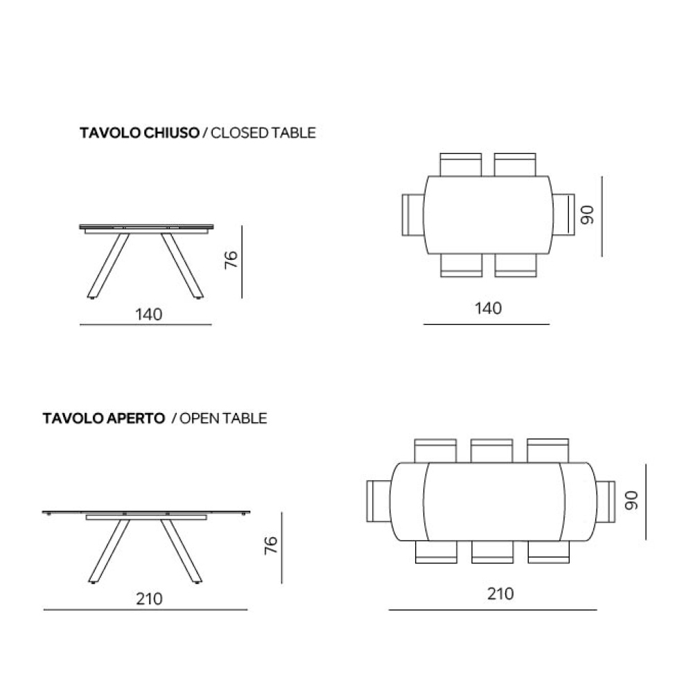 Tavolina ka dy zgjatime anësore 35 cm që ju lejojnë të rrisni lehtësisht sipërfaqen e tavolinës nga 140 cm në 210 cm . Kjo veçori e bën atë ideale si për përdorim të përditshëm ashtu edhe për të pritur mysafirë më të mëdhenj gjatë drekave dhe darkave miqësore, duke u përshtatur lehtësisht me kërkesat e ndryshme të hapësirës.