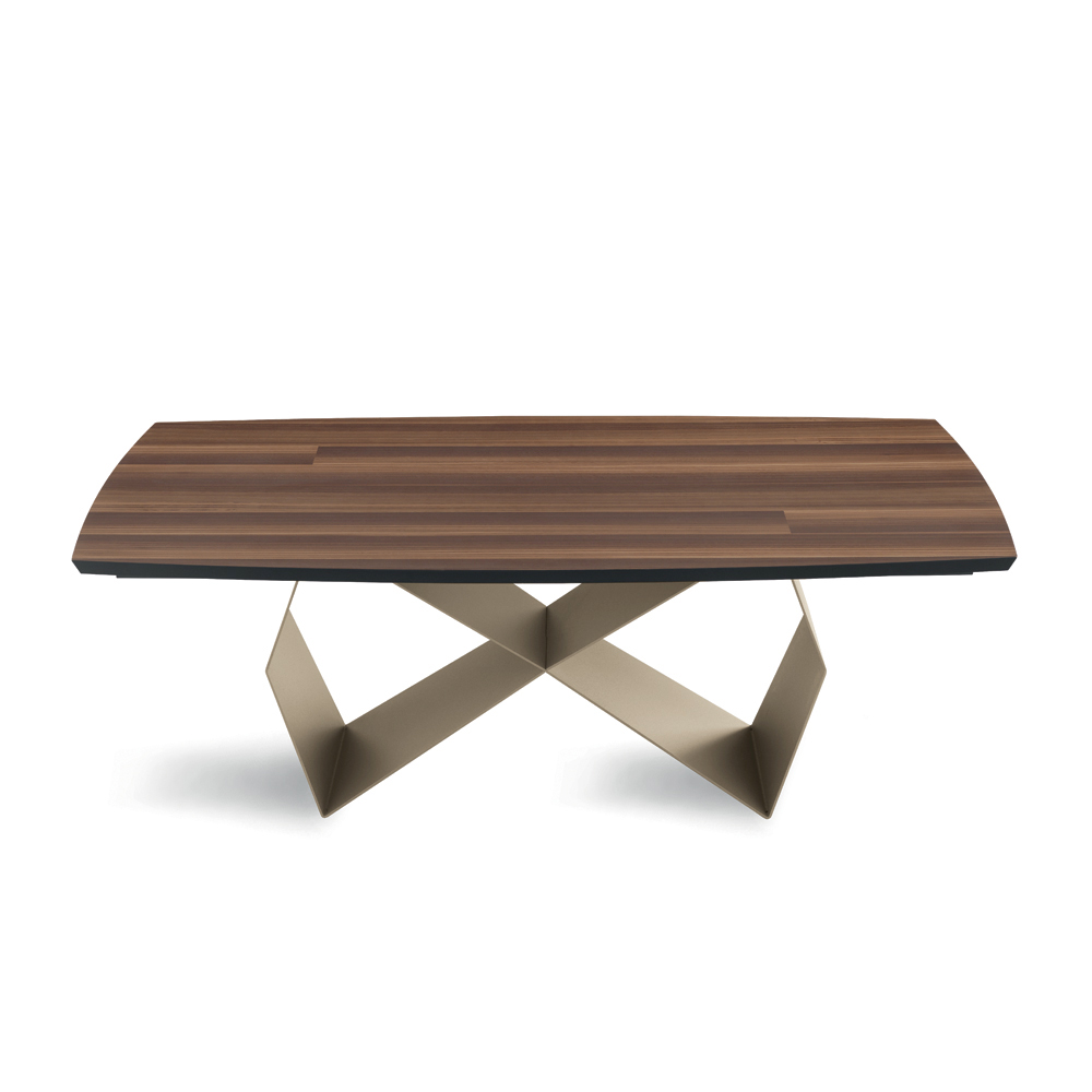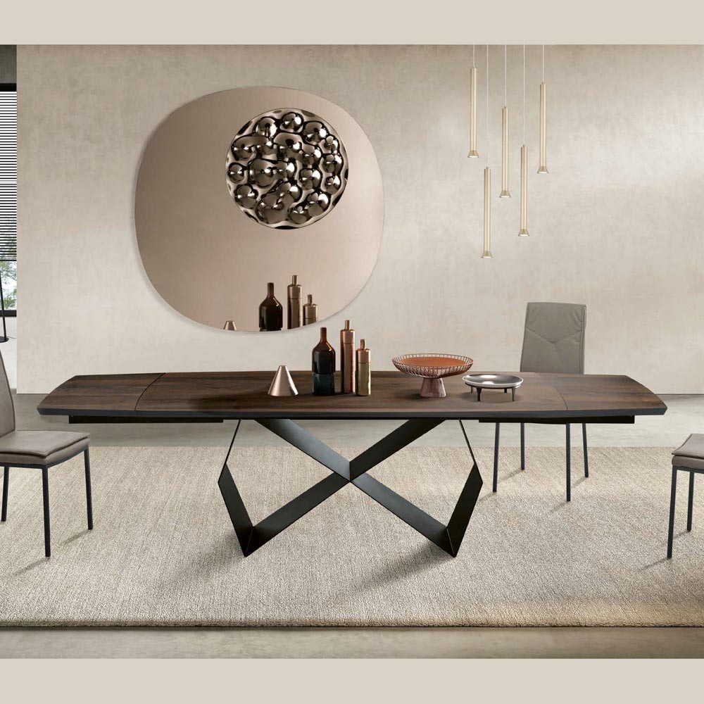 Këmbët metalike , me një formë të theksuar gjeometrike, janë të lyera për të bërë kontrast të bukur me tonin e drurit. Ky kombinim i materialeve jo vetëm që siguron stabilitet të fortë, por gjithashtu shton një element vizual me ndikim, duke e bërë këtë tryezë një pikë qendrore të vërtetë në çdo dhomë ngrënieje ose zonë me plan të hapur.