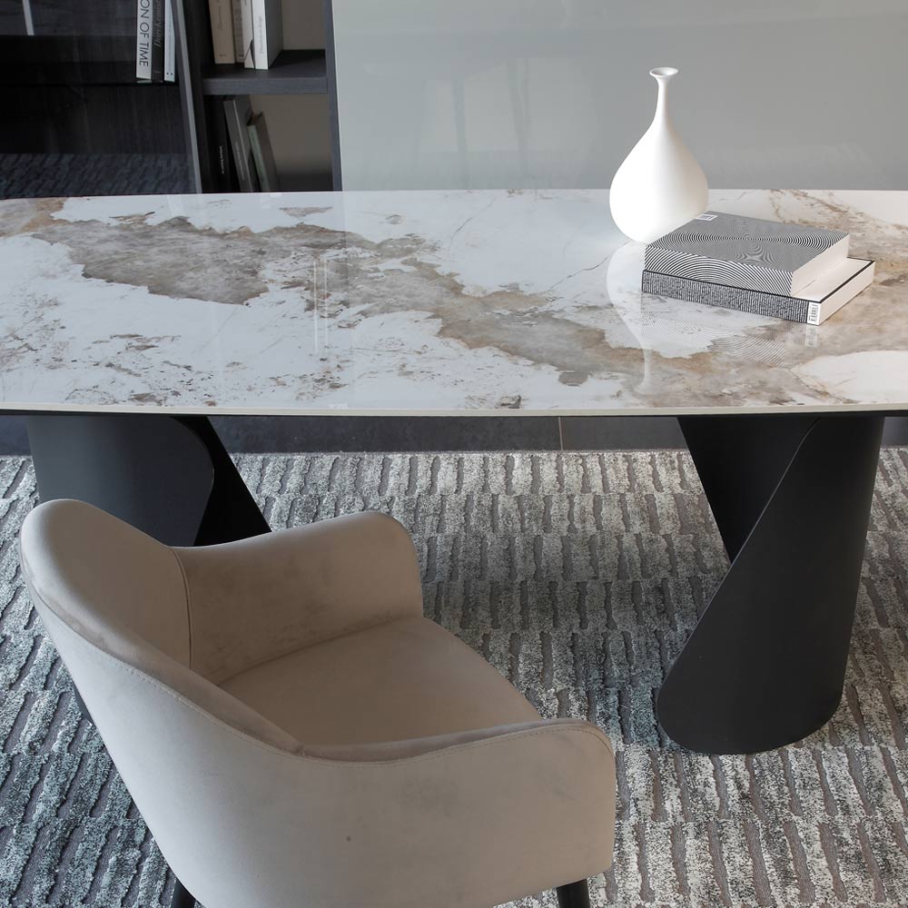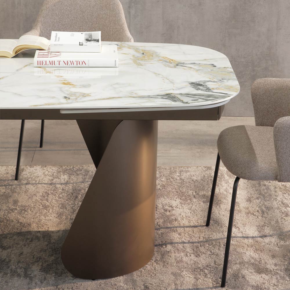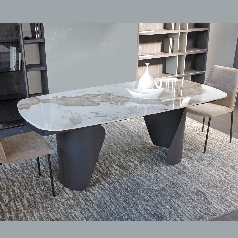 Baza skulpturale në metal të lyer i jep stabilitet dhe një karakter të fortë tavolinës, duke krijuar një kontrast interesant materiali me sipërfaqen. Format gjeometrike asimetrike të këmbëve i shtojnë një prekje artistike dhe të sofistikuar dizajnit të përgjithshëm.