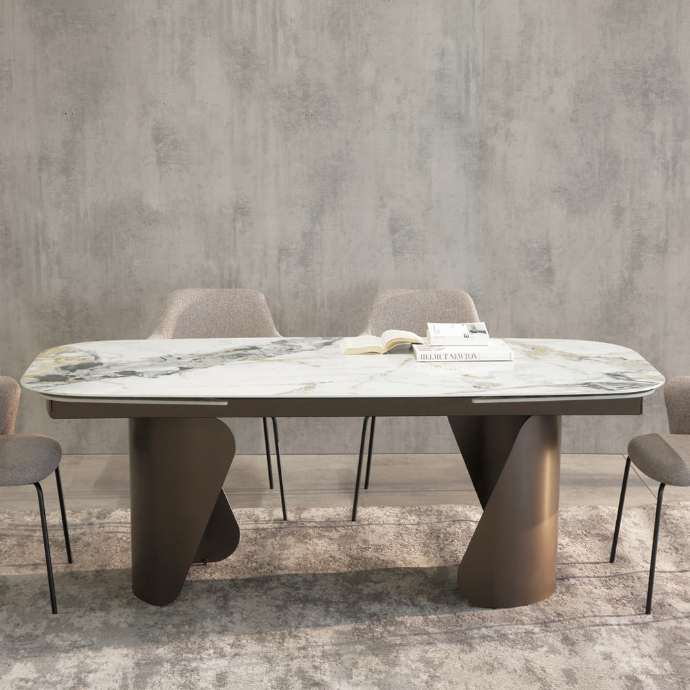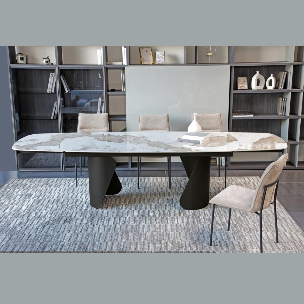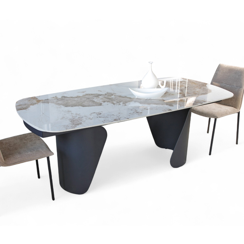 Zbuloni elegancën bashkëkohore të kësaj tavoline ngrënieje prej metali dhe guri të sinterizuar , një kombinim perfekt i dizajnit modern dhe materialeve me cilësi të lartë . Kjo tavolinë është projektuar për ata që duan të mobilojnë hapësirat e tyre me një element me një ndikim të fortë vizual , pa sakrifikuar funksionalitetin .