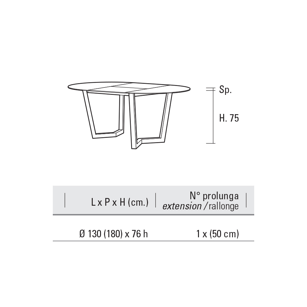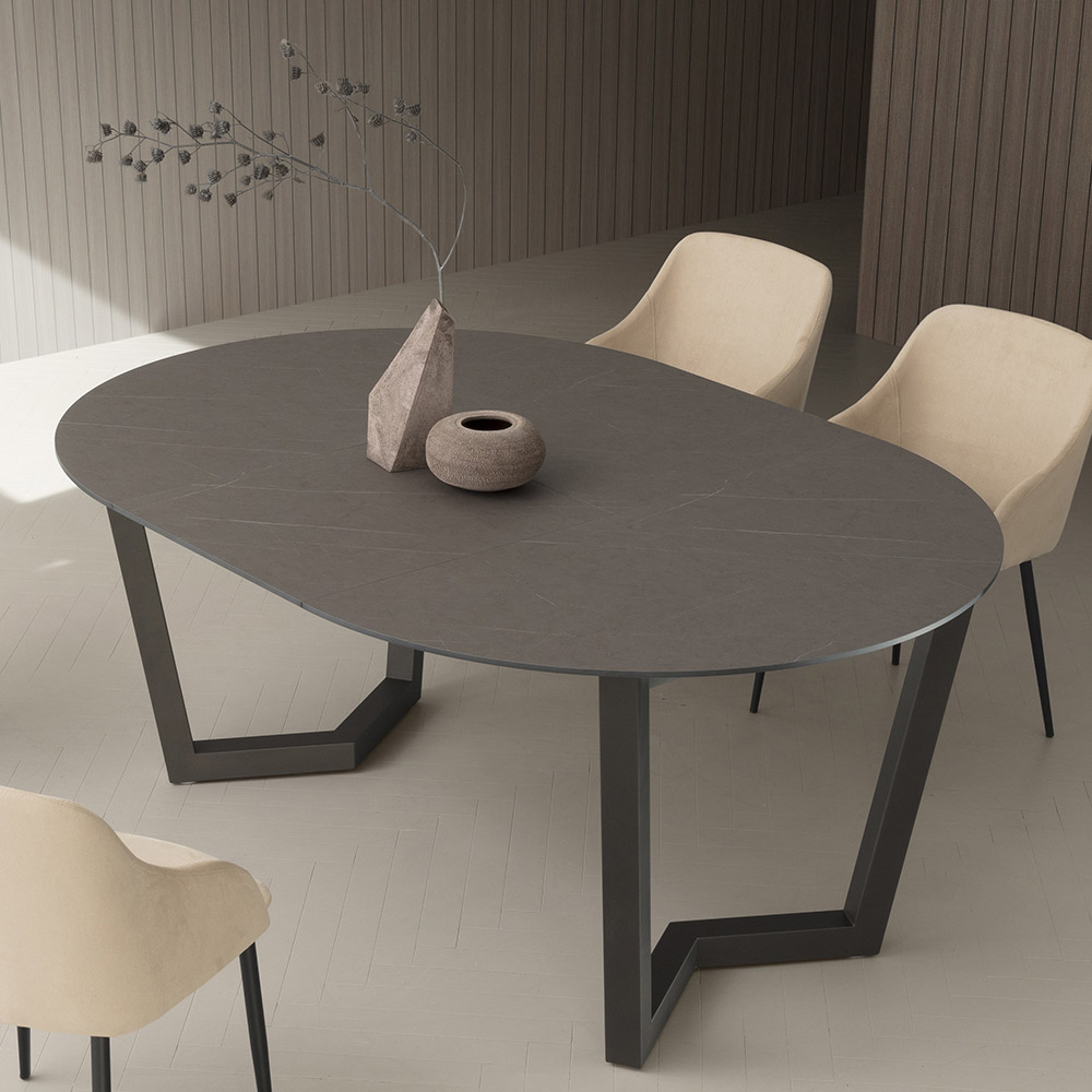 Tavolinë ngrënie me majëe rrumbullakët , e prodhuar në Itali në HPL të shtresuar me trashësi 10 mm me këmbë metalike të lyera me pluhur epoksidi, fundi moka. Një aksesor mobilimi i karakterizuar nga një strukturë elegante dhe skulpturore që lind nga kombinimi i materialeve të natyrës së ndryshme së bashku me pasionin për mjeshtëri.