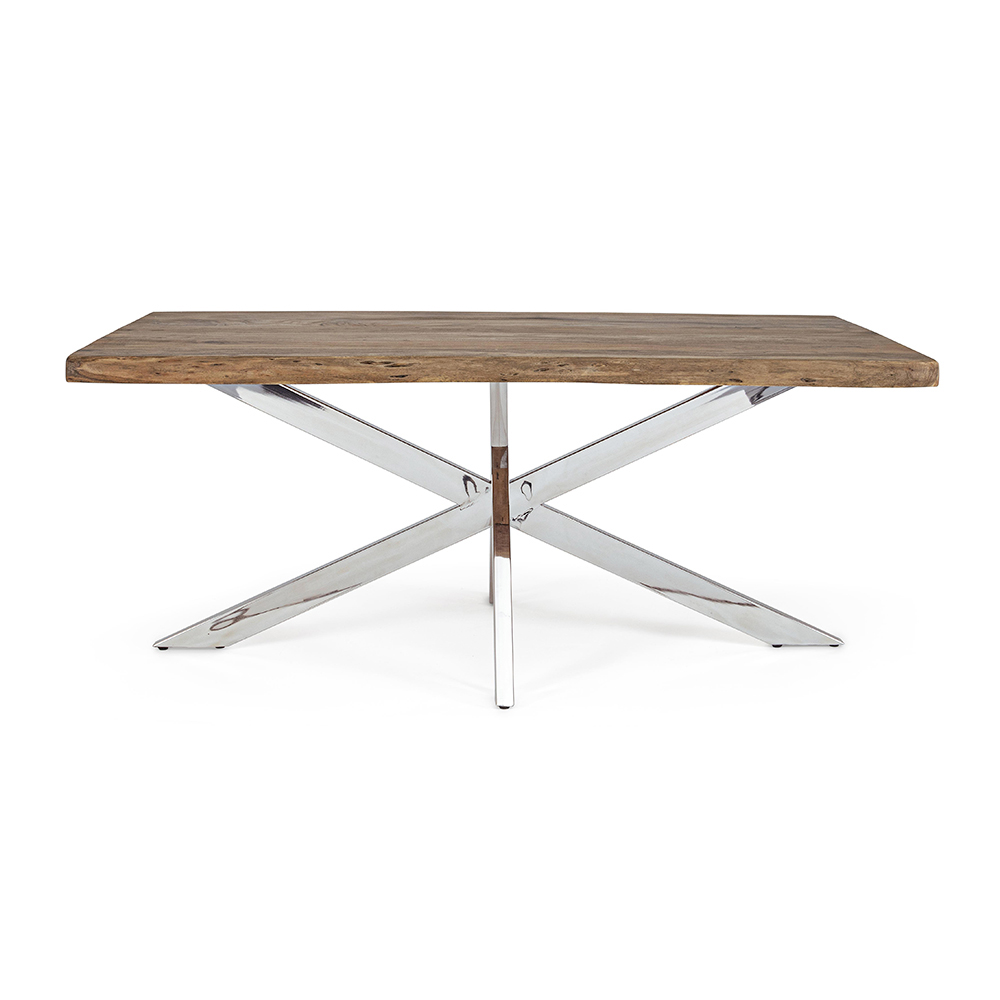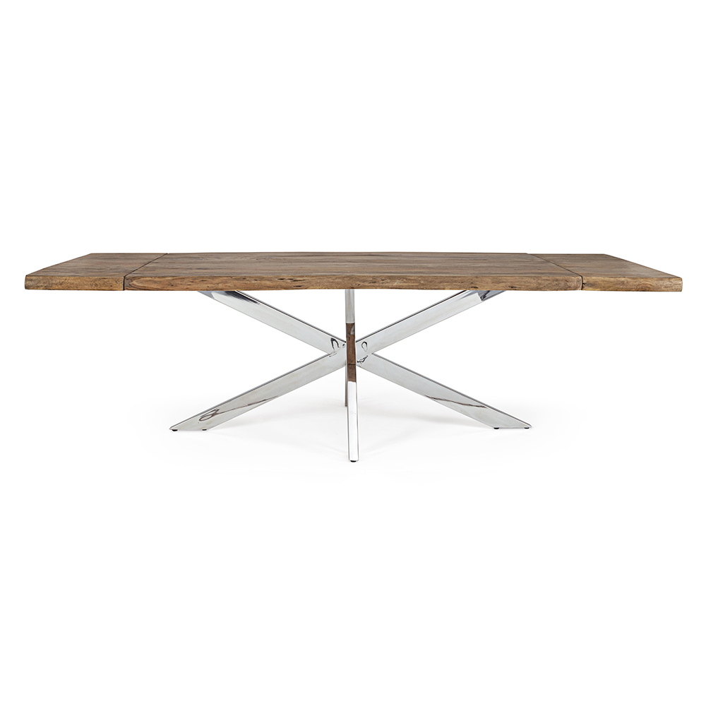 Tavolinë ngrënieje e zgjatur me bazë druri të fortë akacie dhe çeliku, 10 persona.