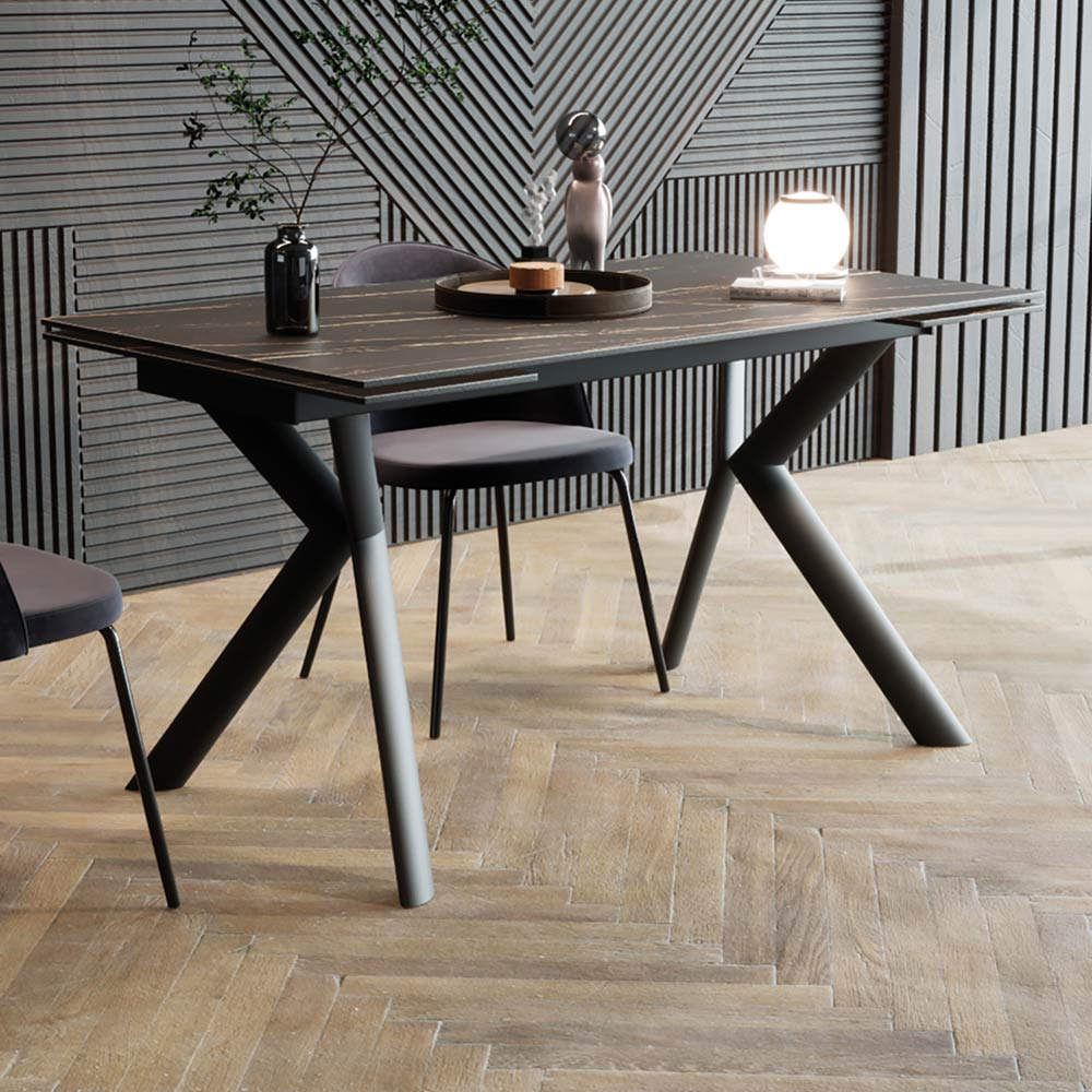 Tavolinë ngrënieje e zgjerueshme me strukturë metalike të lyerme antracit dhe majë prej guri porcelani në dekorimin sahara noir .Një produkt solid dhe rezistent i karakterizuar nga një dizajn ekskluziv dhe modern, ideal për ata që duan një stil thelbësor dhe të gjithanshëm, i aftë për të kompletuar me elegancë dhe personalitet arredimin e dhomës së ngrënies ose kuzhinës së tyre. Falë kombinimit të mrekullueshëm të materialeve dhe përfundimeve, ai përfaqëson zgjidhjen ideale për ata që kanë nevojë për një produkt funksional, por në të njëjtën kohë me ndikim të madh vizual .