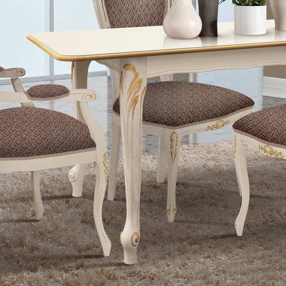 Tavolinë e zgjatur për dhomën e ngrënies të stilit klasik e prodhuar në Itali në dru të bardhë me detaje të arta. Tabela ka dy zgjatime të brendshme prej 40 cm secila të cilat lejojnë zgjatjen e saj nga 140 në 220 cm. Prodhuar tërësisht në Itali dhe punuar me dorë nga mjeshtra të aftë , të përfunduara me mençuri dhe shije për elegancë. Prodhimi kryhet duke përdorur materiale të shkëlqyera , dhe duke kryer punënmedorë me kujdesin dhe profesionalizmin maksimal që i dallon produktet Made in Italy .