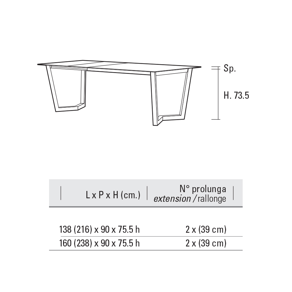 të bëra në të njëjtin material si pjesa e sipërme, ato lejojnë që ky element arredimi të zgjerohet deri në një gjatësi maksimale prej 238 cm, duke krijuar kështu një