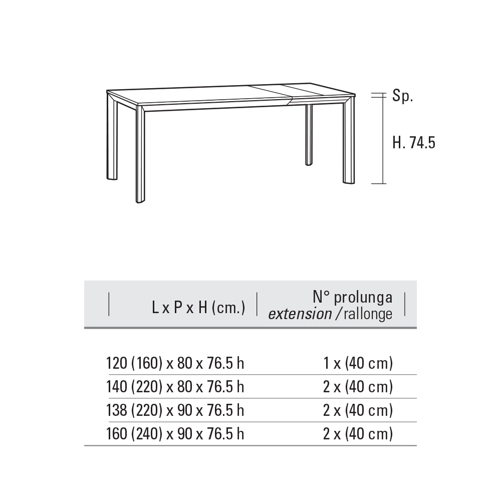 Madhësitë e disponueshme:- L 120/160 x D 80 x H 76,5 cm (1 zgjatim);