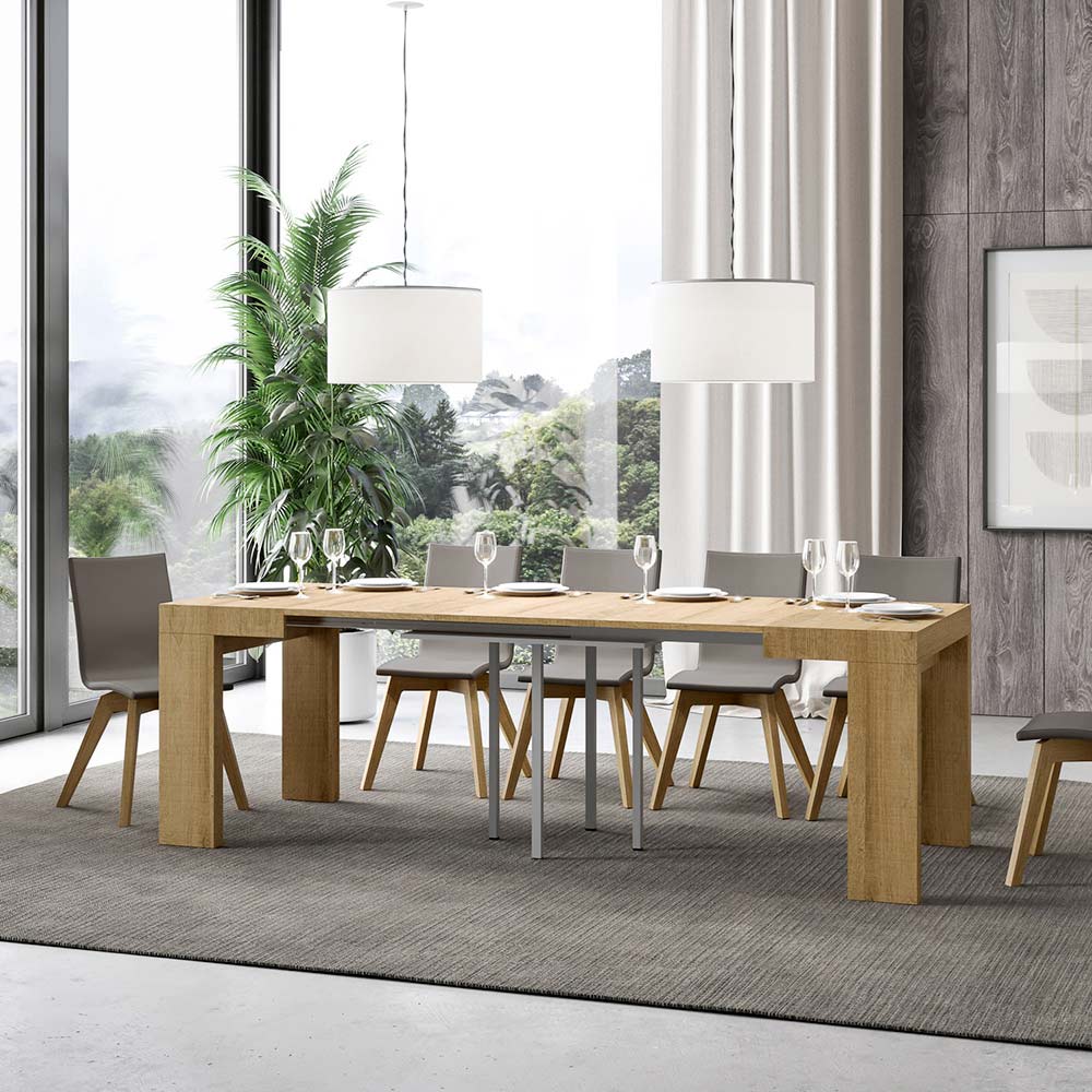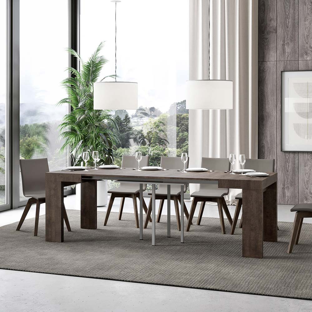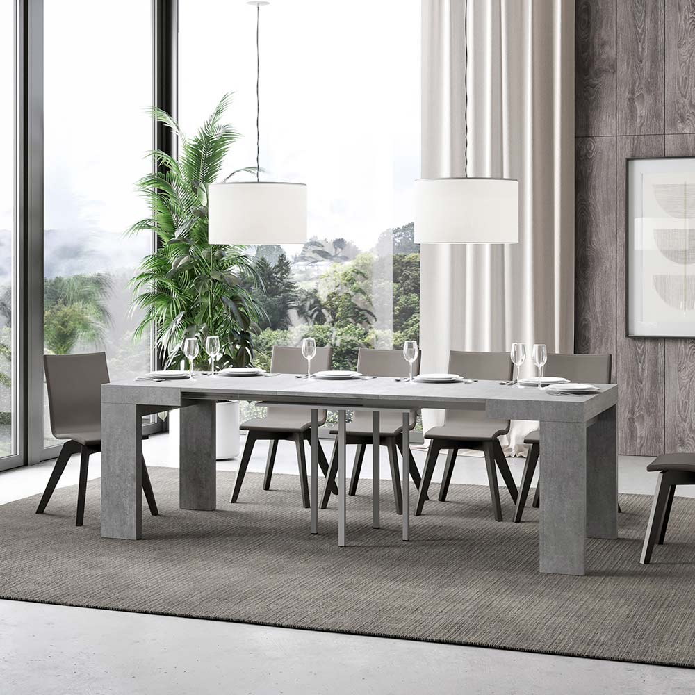 Tavolinë ngrënieje e zgjatur e bërë nga mikrogrimca druri, tërësisht Prodhuar në Itali. Zgjatjet mund të futen në mënyrë progresive, duke lejuar konfigurime me gjatësi të ndërmjetme, kështu që ju mund të zgjidhni nëse do ta përdorni me një, dy ose tre shtesa bazuar në nevojat tuaja të hapësirës. Kur nuk përdoren, shtesat duhet të ruhen diku tjetër dhe nuk mund të vendosen brenda strukturës së tabelës. E pajisur me një sistem qendror mbështetës praktik me 4 mbështetëse tokësore, i cili lejon që tavolina të mbetet e qëndrueshme dhe e besueshme edhe kur hapet në shtrirje maksimale.